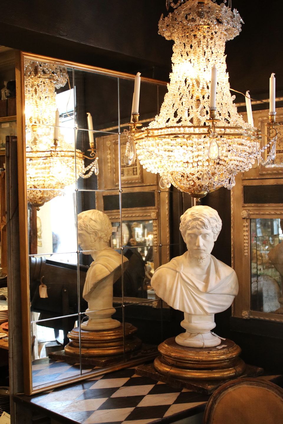 Vi tilbyder et bredt udvalg af gamle møbler med karakter , prismelysekroner og franske kirkestager.