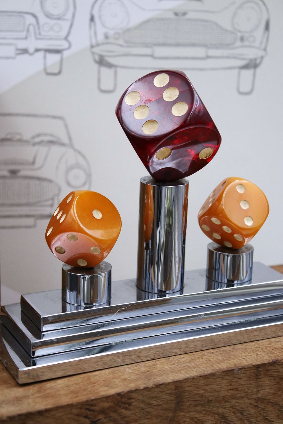Dekorativ , gammel spille pokal i krom med 3 store terninger i farvet akryl...
