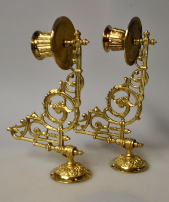 Par messing klaverstager, 19. årh. Med dekorationer af maskeroner. L: 19,5 cm.