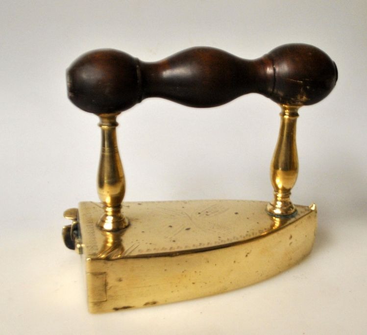 Messing strygejern, 19. årh. Danmark. Stemplet. Med graveringer. Med træhåndtag. L.: 14 cm. H.: 12,5 cm.