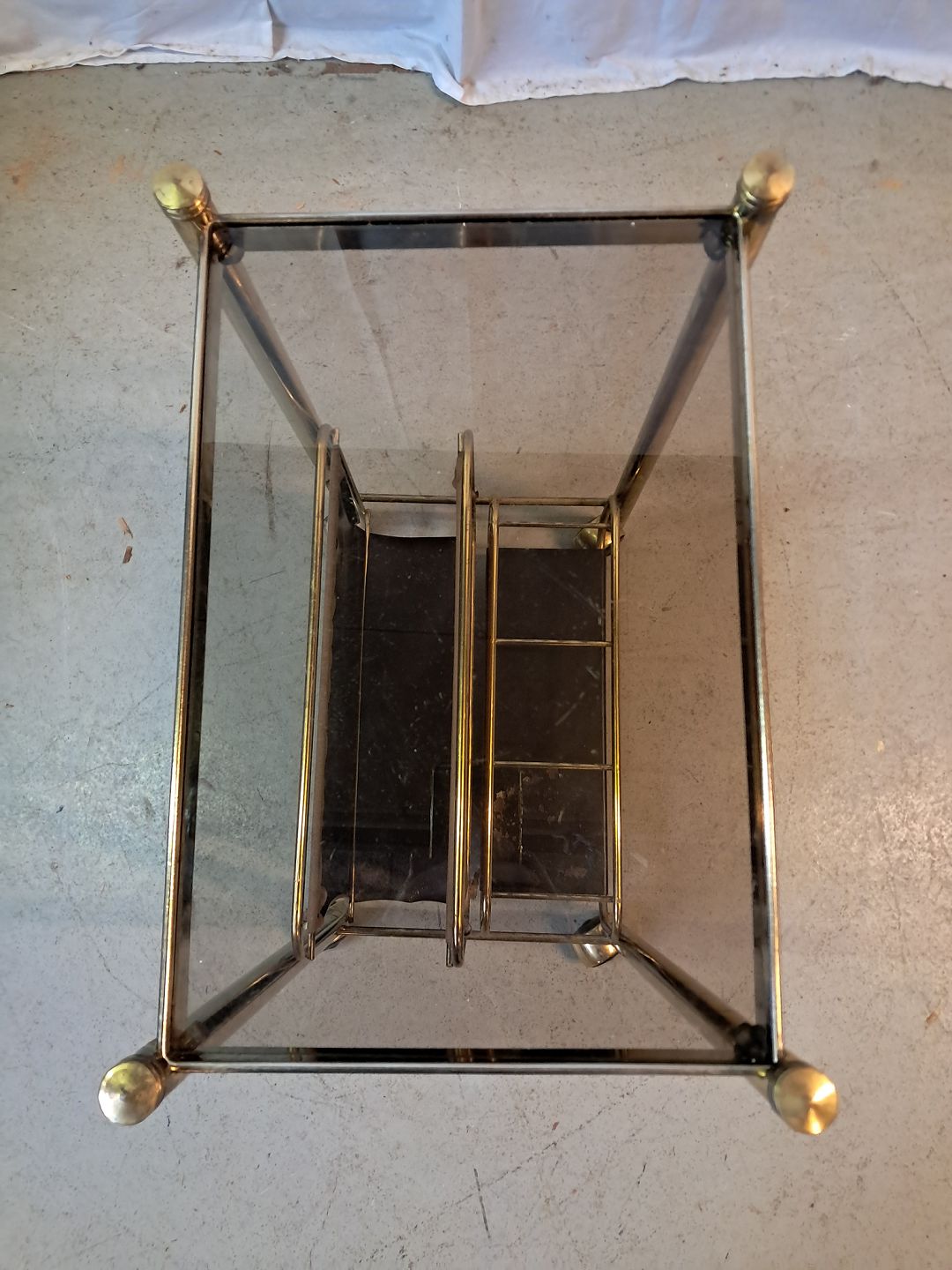 Bord i metal med magasinholder, flaskerum og glasplade, fra 1980erne.