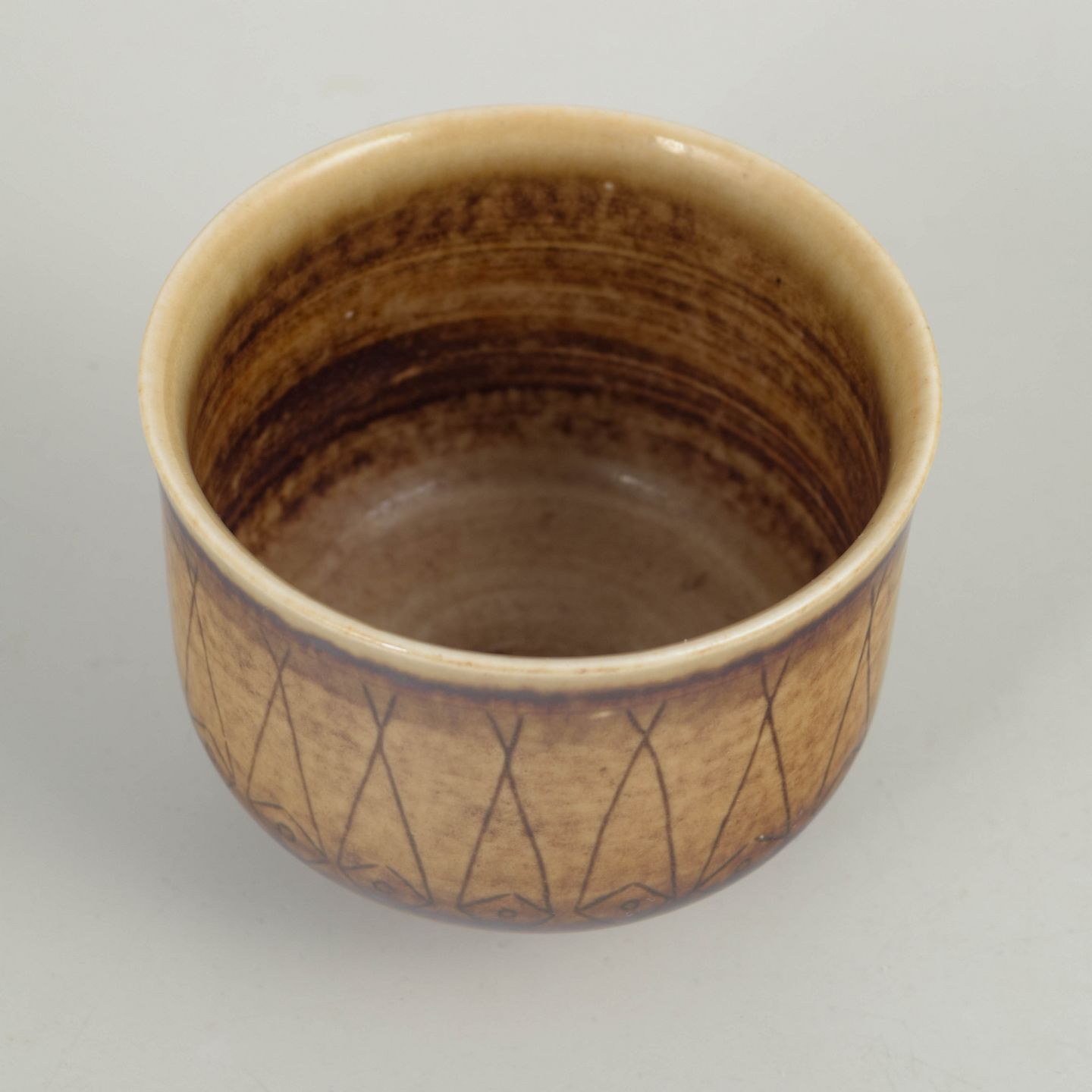 Drejet skål i stentøj med let fodring og afrundet krop. Udført med varm, brunlig glasur og indridset geometrisk dekoration i gentagne lodrette felter omkring ydersiden. Indvendigt ses en mere tæt, levende glasur. Signeret i bunden og fremstillet hos Höganäs i 1970’erne.