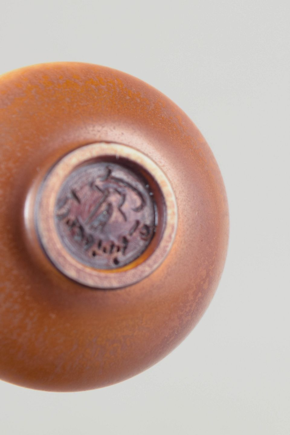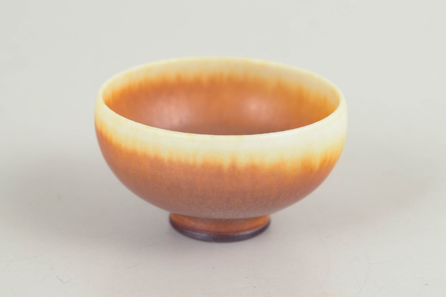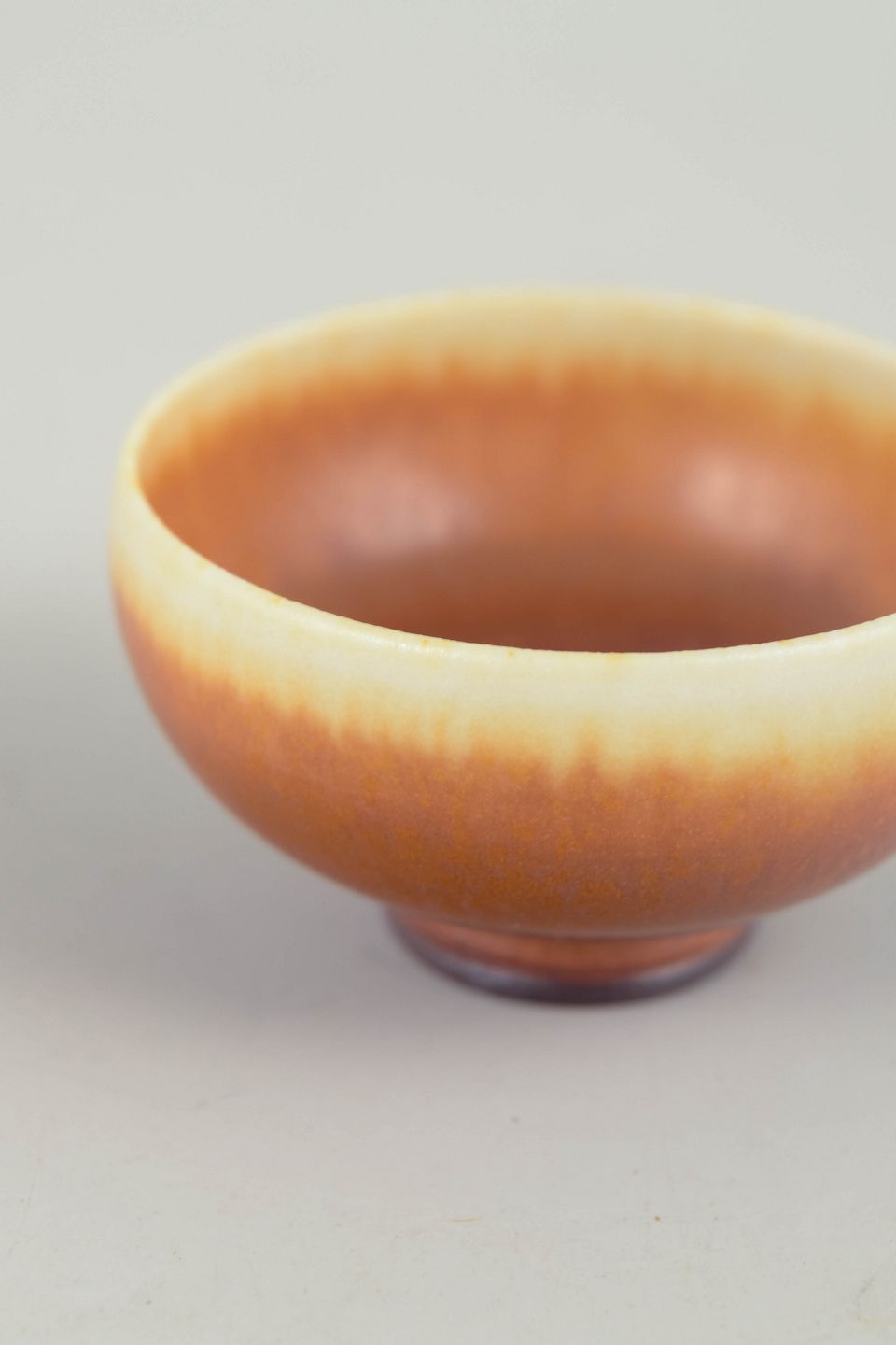 Miniature skål i drejet stentøj med fin, balanceret form og karakteristisk glasur i varme nuancer af brun og creme. En lille, raffineret genstand udført med stor præcision, typisk for Berndt Fribergs arbejder i midten af det 20. århundrede.
