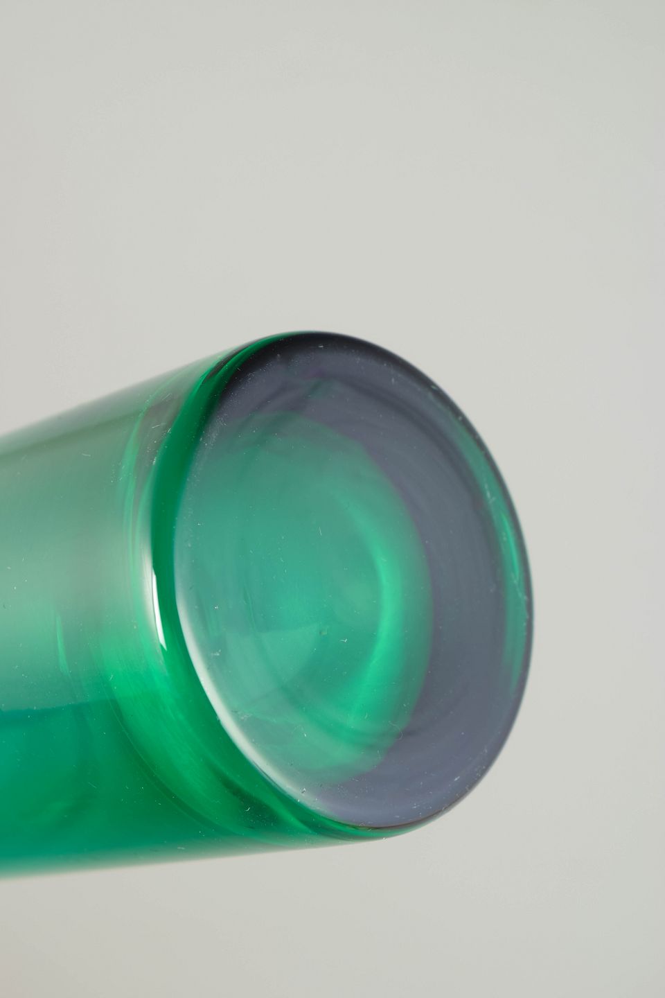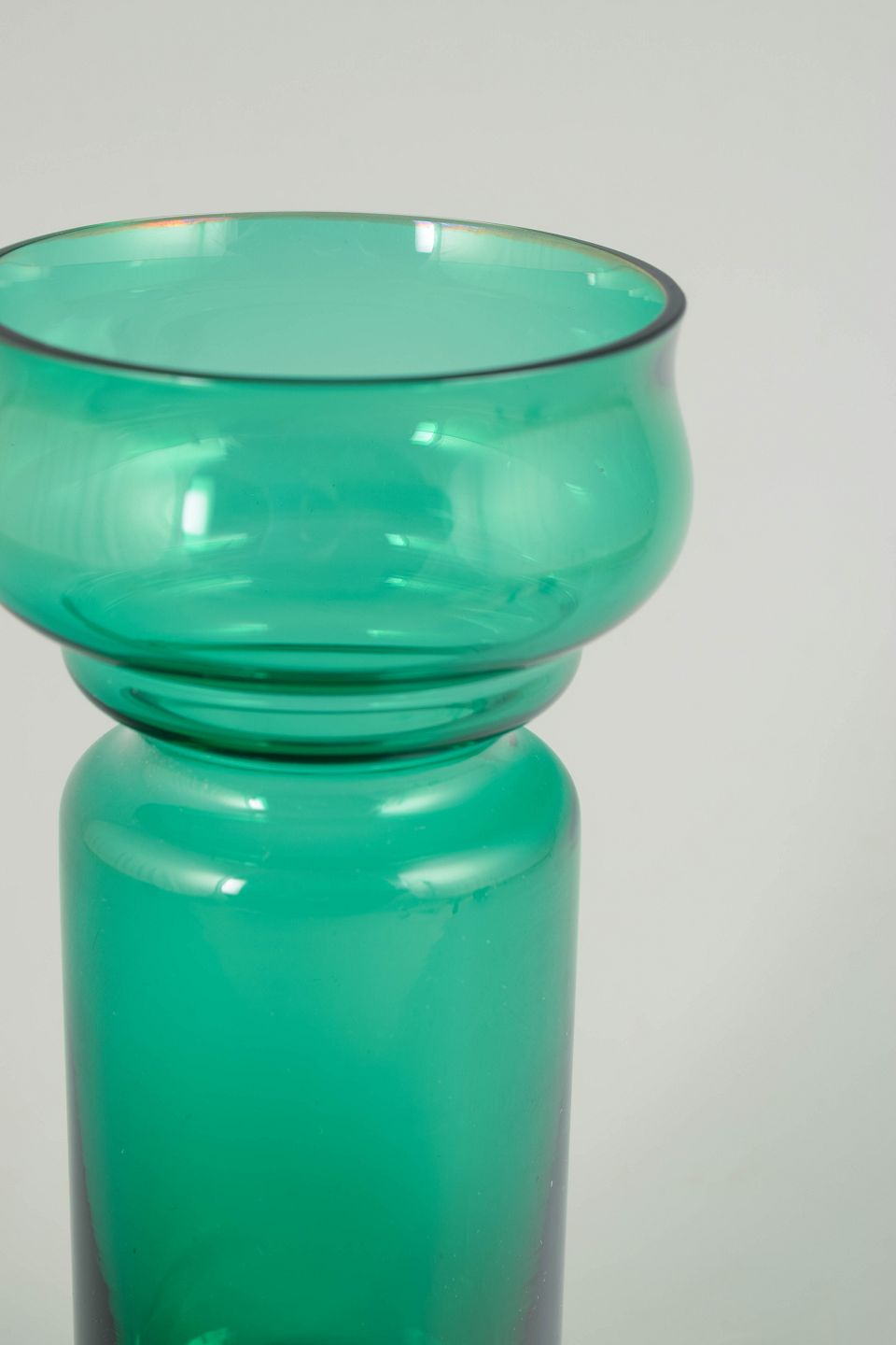 Elegant vase i klart turkisgrønt glas med balanceret, skulpturel profil og blød, rundet form. Mundblæst udførelse med markeret skålformet overdel og cylindrisk underdel, typisk for finsk kunstglas fra 1970’erne.