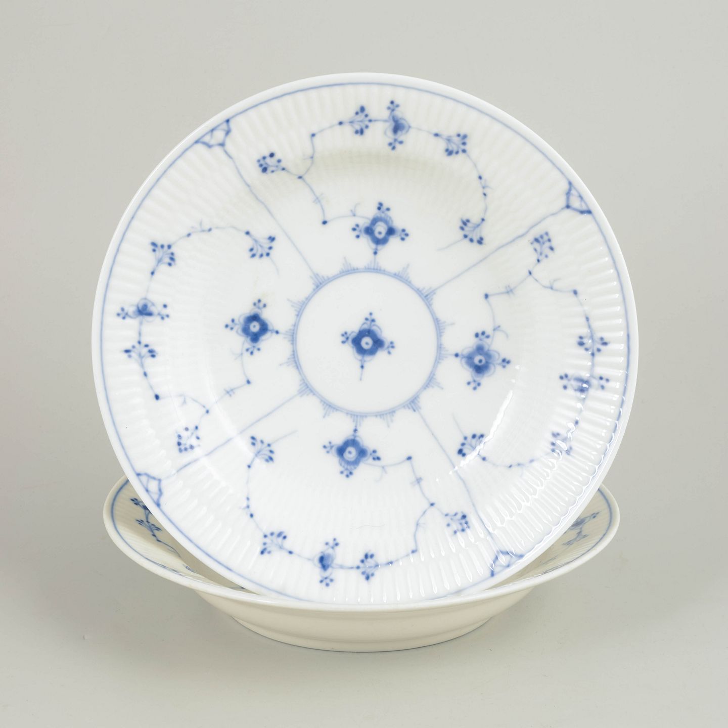 To dybe tallerkener i håndmalet porcelæn med klassisk Musselmalet dekoration i underglasurblå. Det karakteristiske riflede porcelæn og det detaljerede blomster- og rankemotiv er udført i traditionel stil, som kendetegner Bing & Grøndahls produktion fra slutningen af 1800-tallet. Formen og dekorationen følger det historiske Musselmalet-mønster.