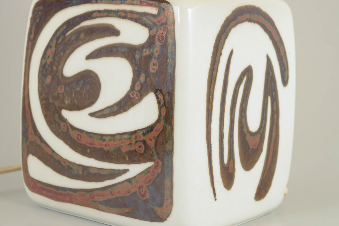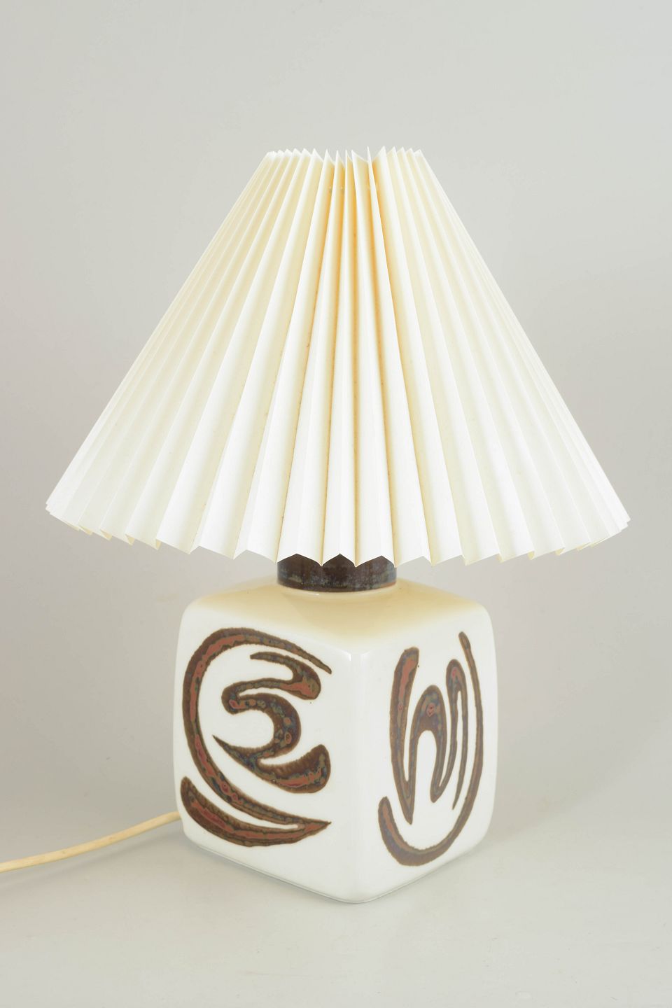 Keramisk bordlampe i stentøj med hånddekoreret relief i brune og sorte toner på hvid bund. Kvadratisk lampefod med grafisk, orientalsk inspireret ornamentik. Original plisseret Le Klint skærm. Et markant eksempel på svensk modernisme og dansk design fra 1960’erne.