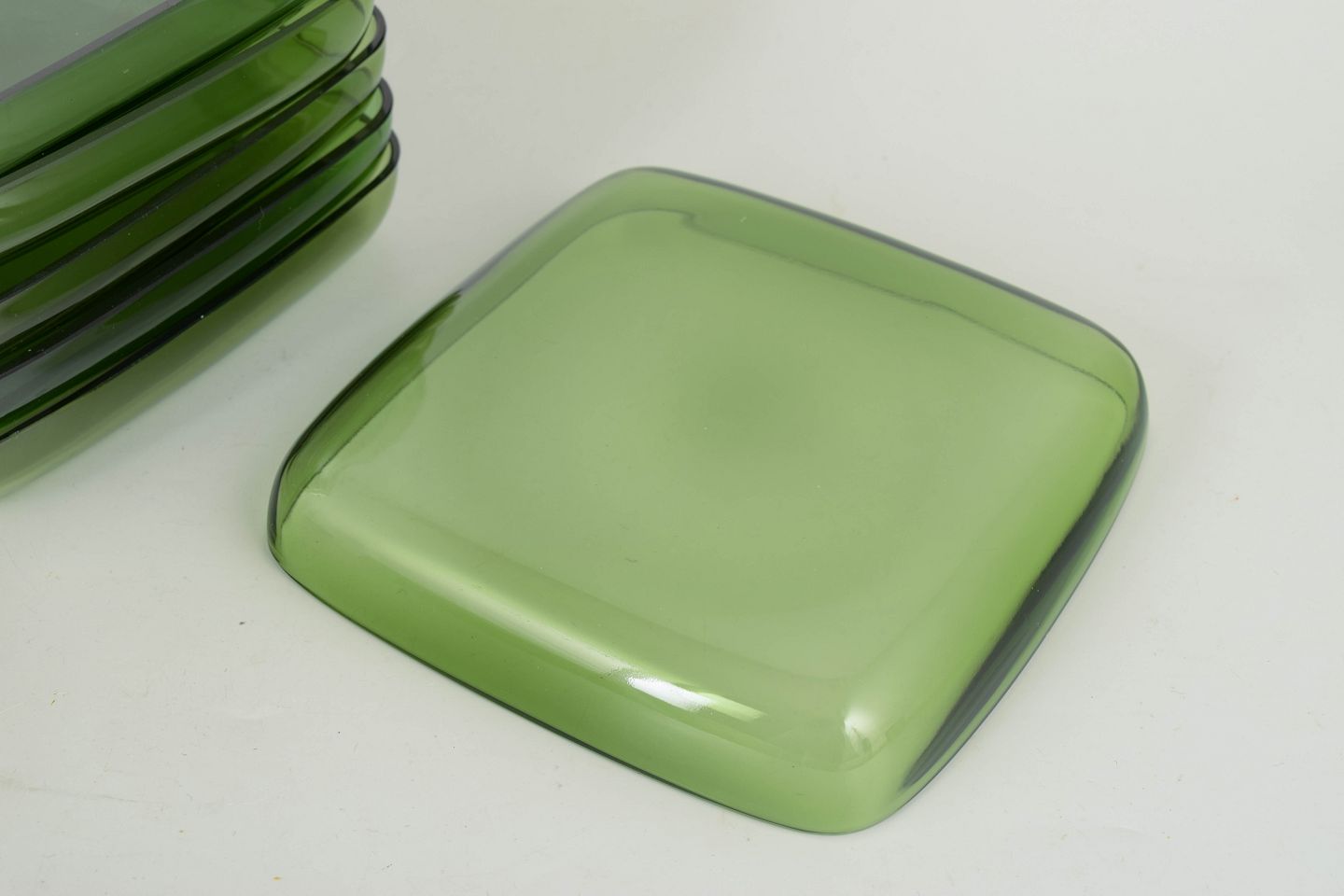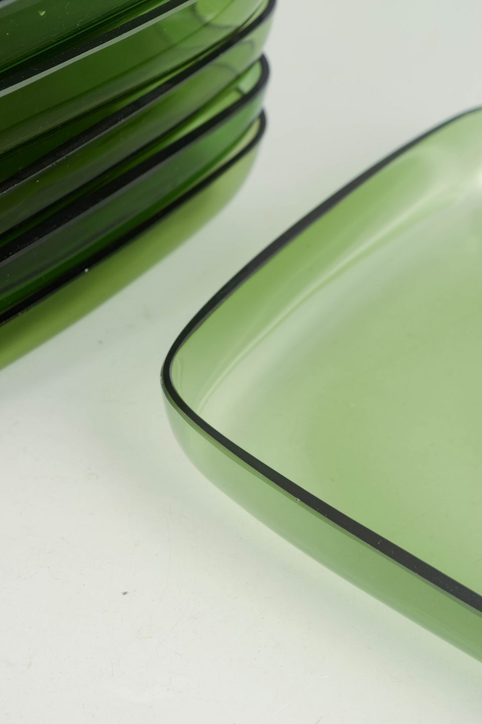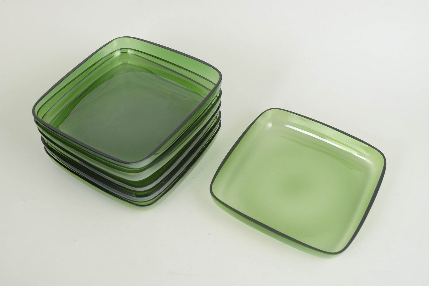 Sæt bestående af seks håndlavede tallerkener i grønt glas med blødt afrundede hjørner og let opadbøjet kant. Et enkelt og funktionelt formsprog med tydelig skandinavisk modernistisk karakter.