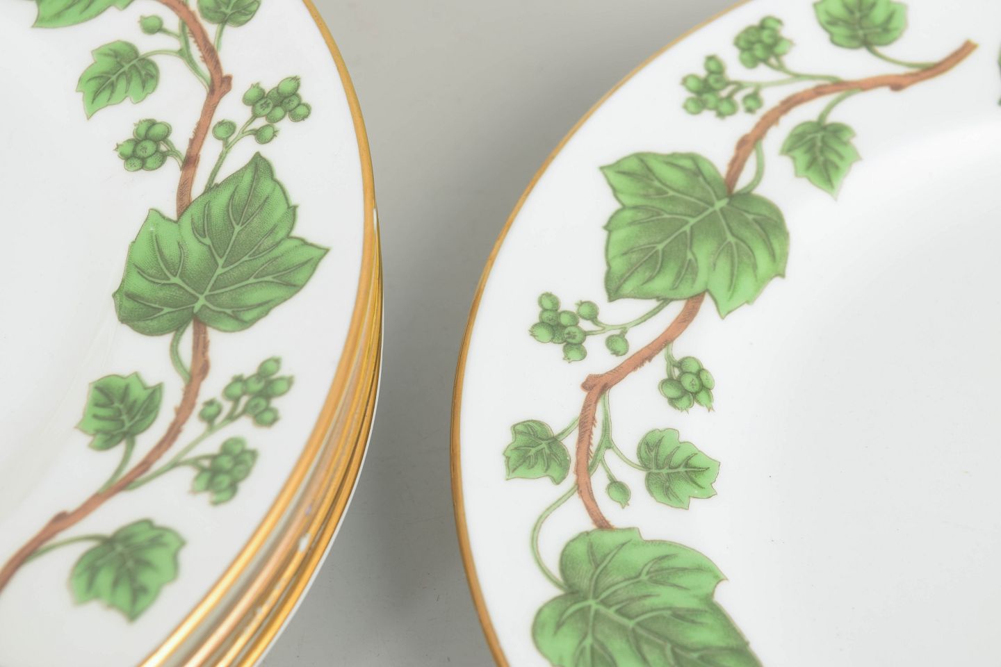 Dekorative fajancetallerkener med grøn vedbend dekoration og guldkant, produceret i Staffordshire, England.