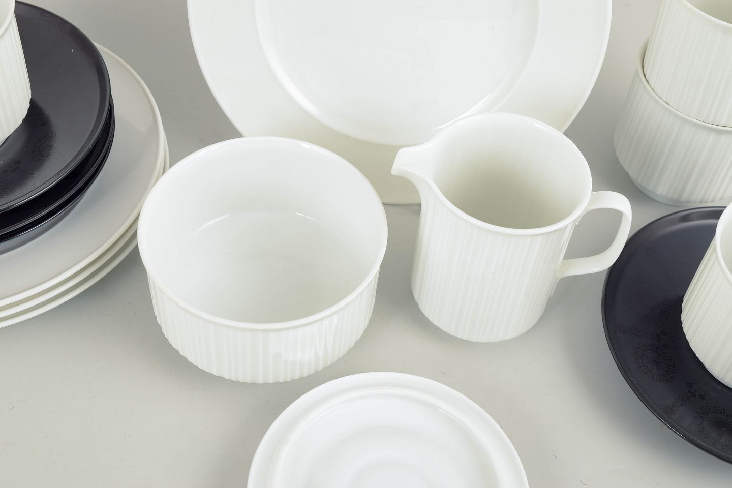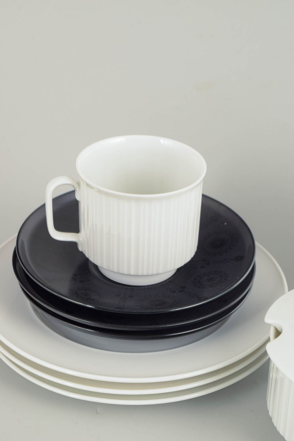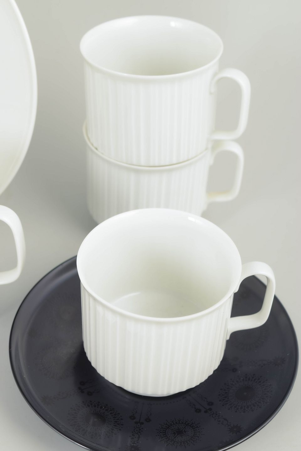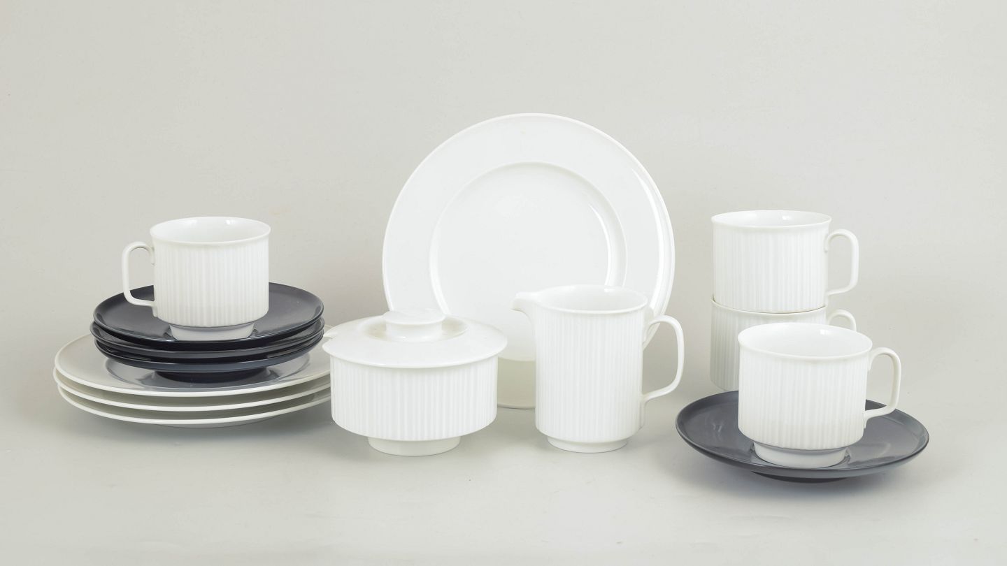Komplet kaffestel i hvidt porcelæn med karakteristisk rillet overflade, kombineret med kontrasterende underkopper og tallerkener. Elegant og funktionelt formsprog med tydelig nordisk modernistisk karakter.