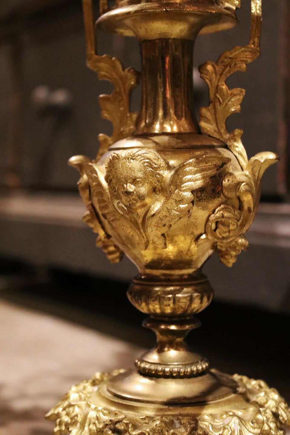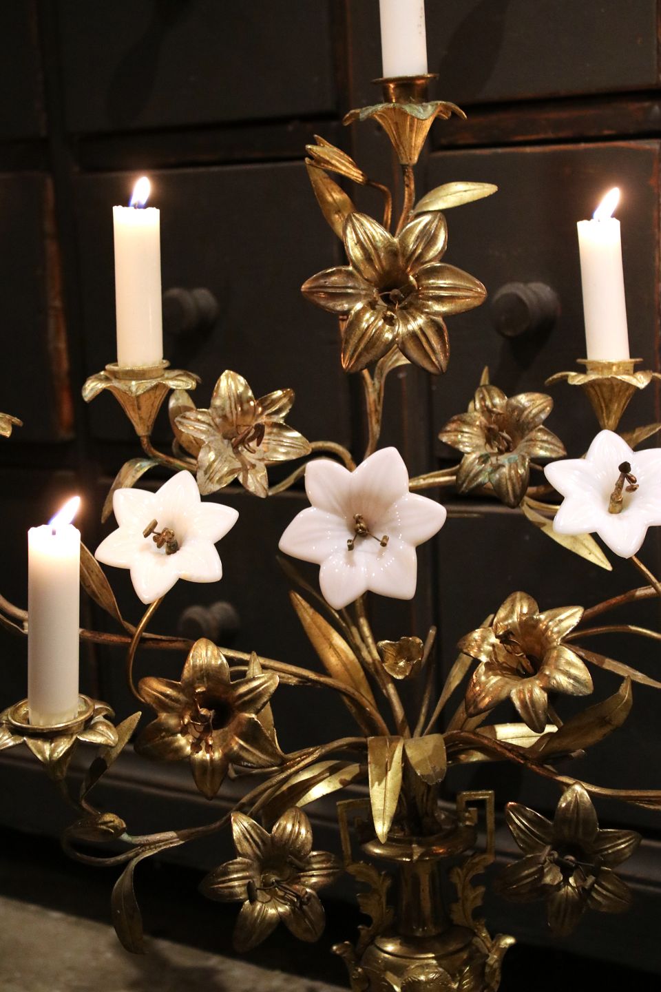 Gammel Fransk kirkelysestage i bronze , dekoreret med bronze liljer og 3 gamle hvide opaline glas liljer...