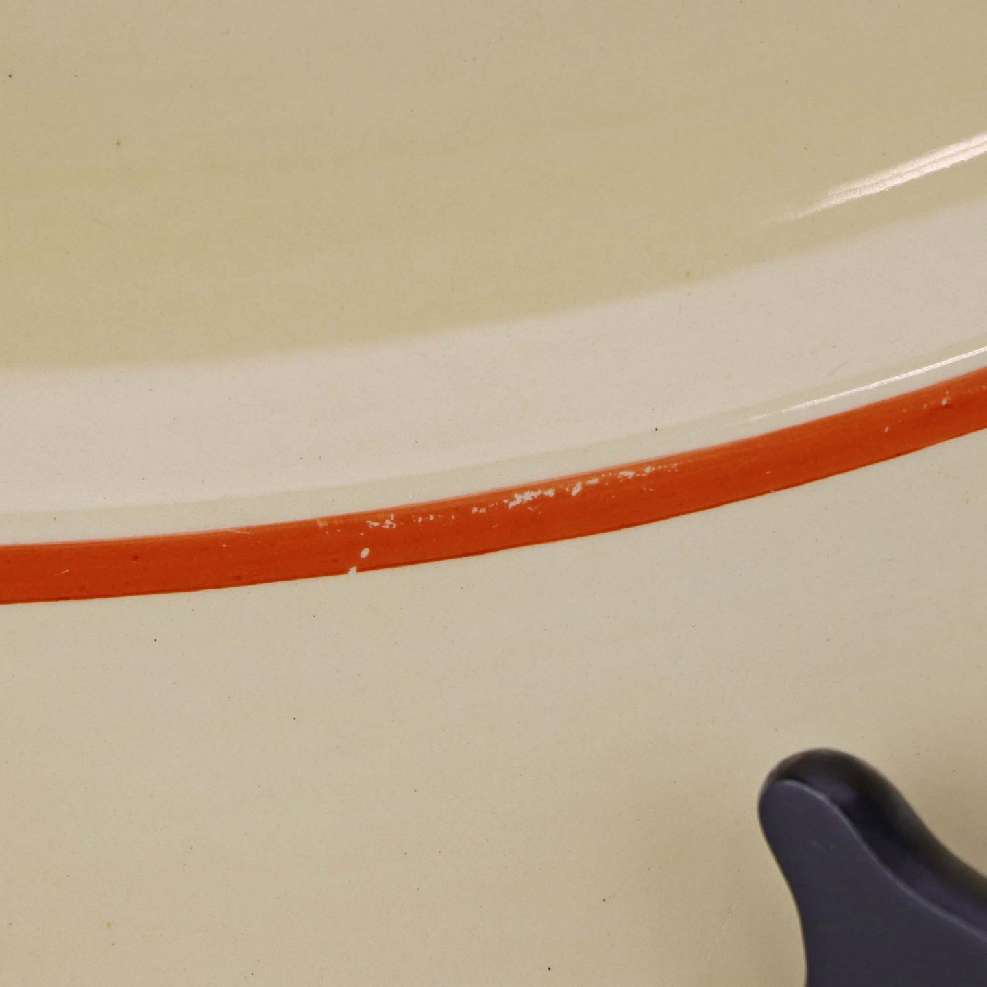 Fajancestel i stelform E med orangerød og brunt dekoration på gul baggrund og med orangerød kant.
