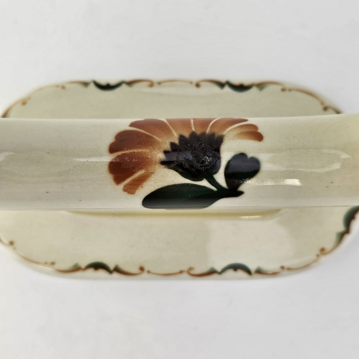 Fremstår med krakelering i glasuren og almindelige brugsspor