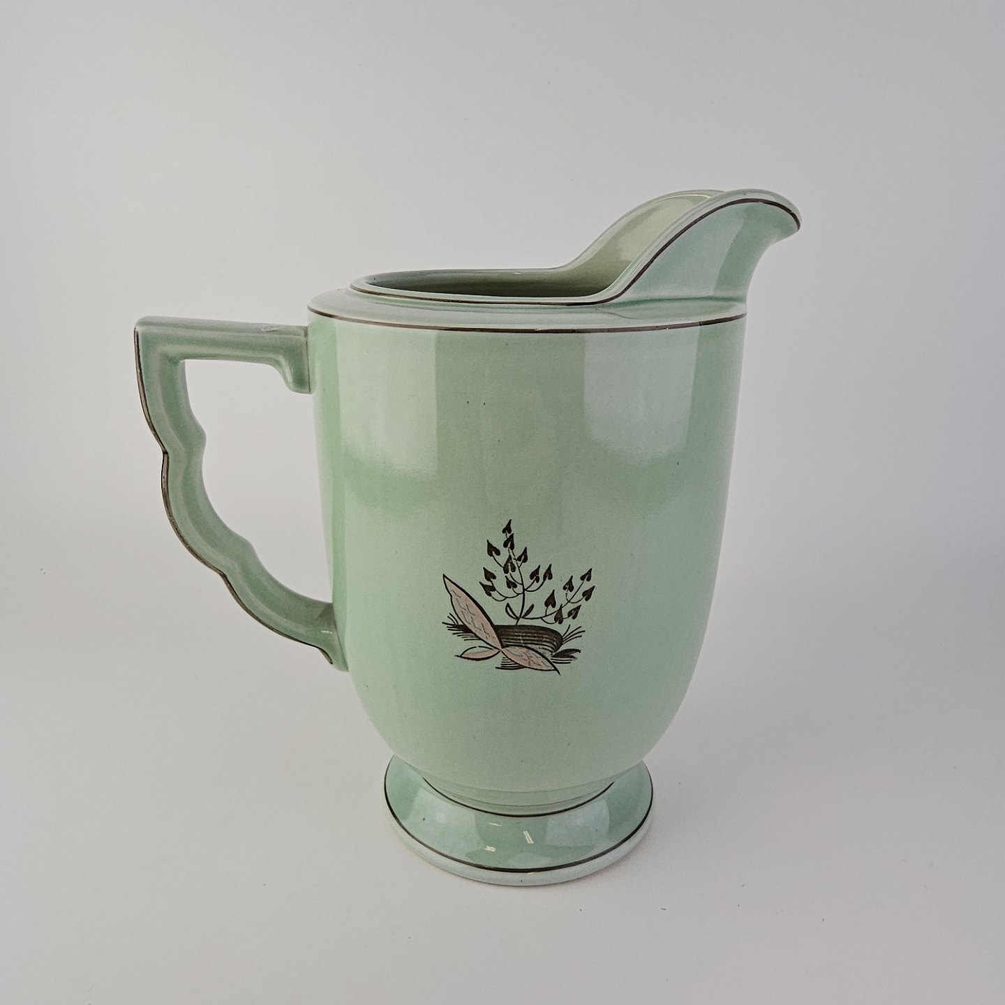 Stel i lysegrøn fajance med natur dekoration og flettet kant
