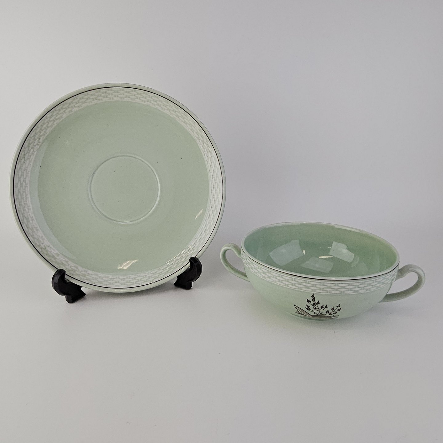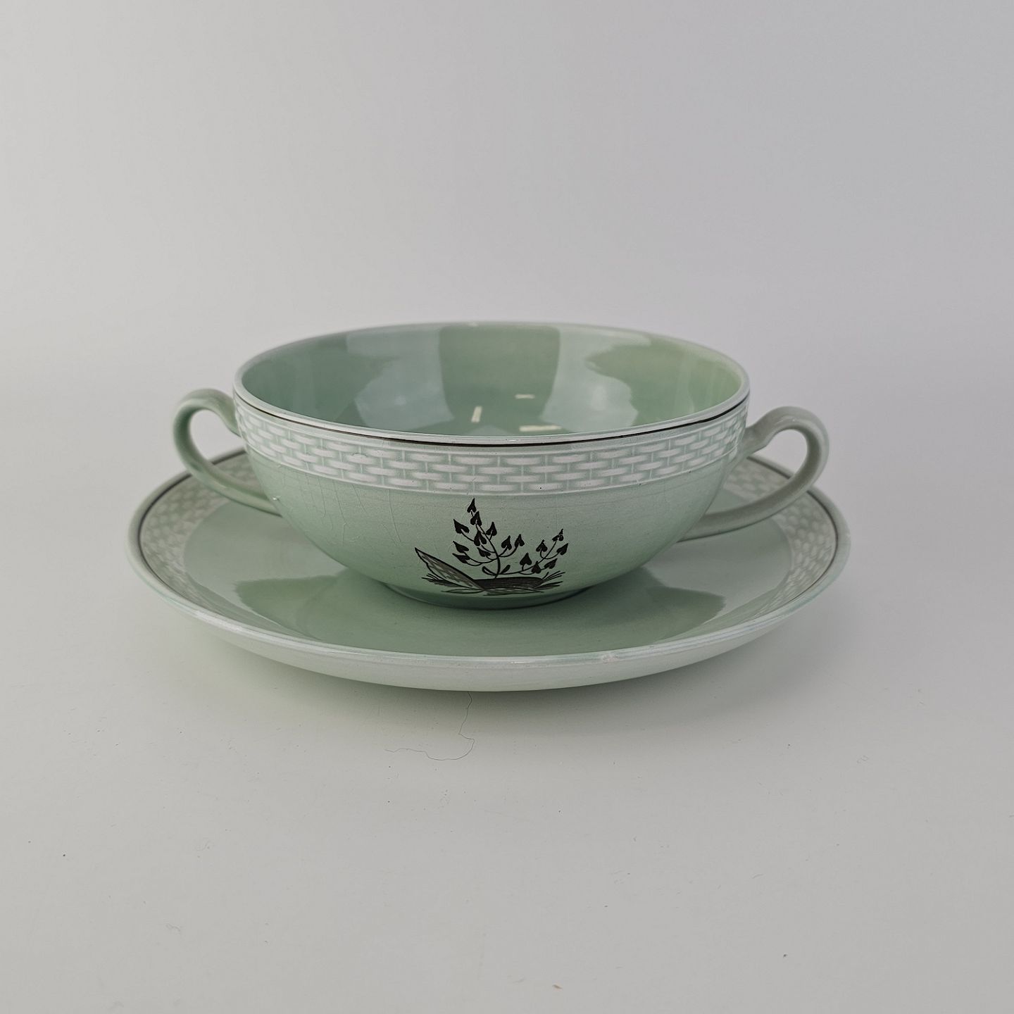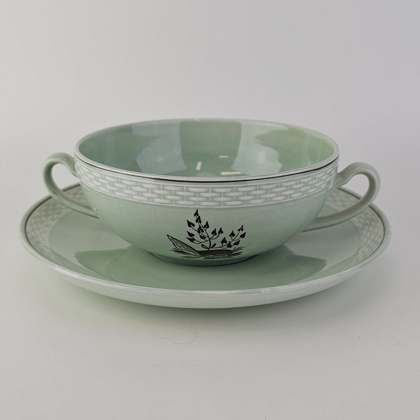 Stel i lysegrøn fajance med natur dekoration og flettet kant
