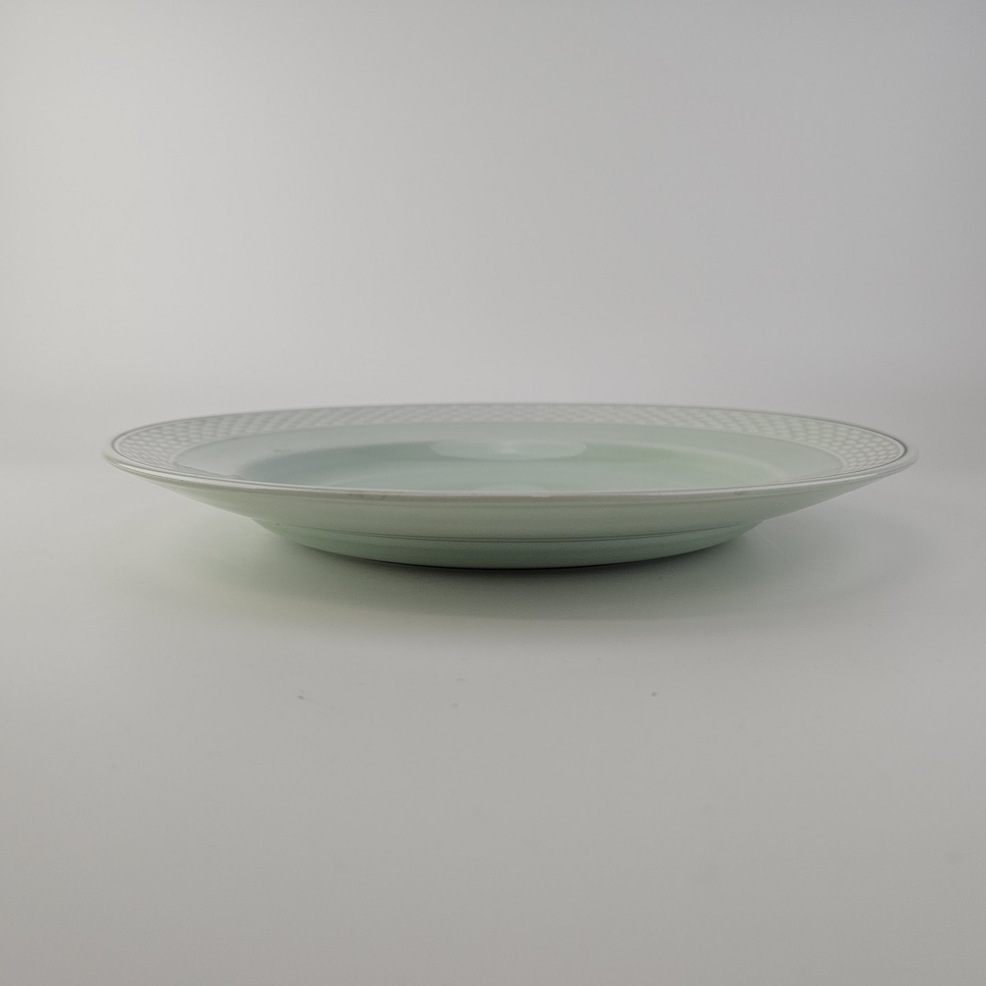 Stel i lysegrøn fajance med natur dekoration og flettet kant