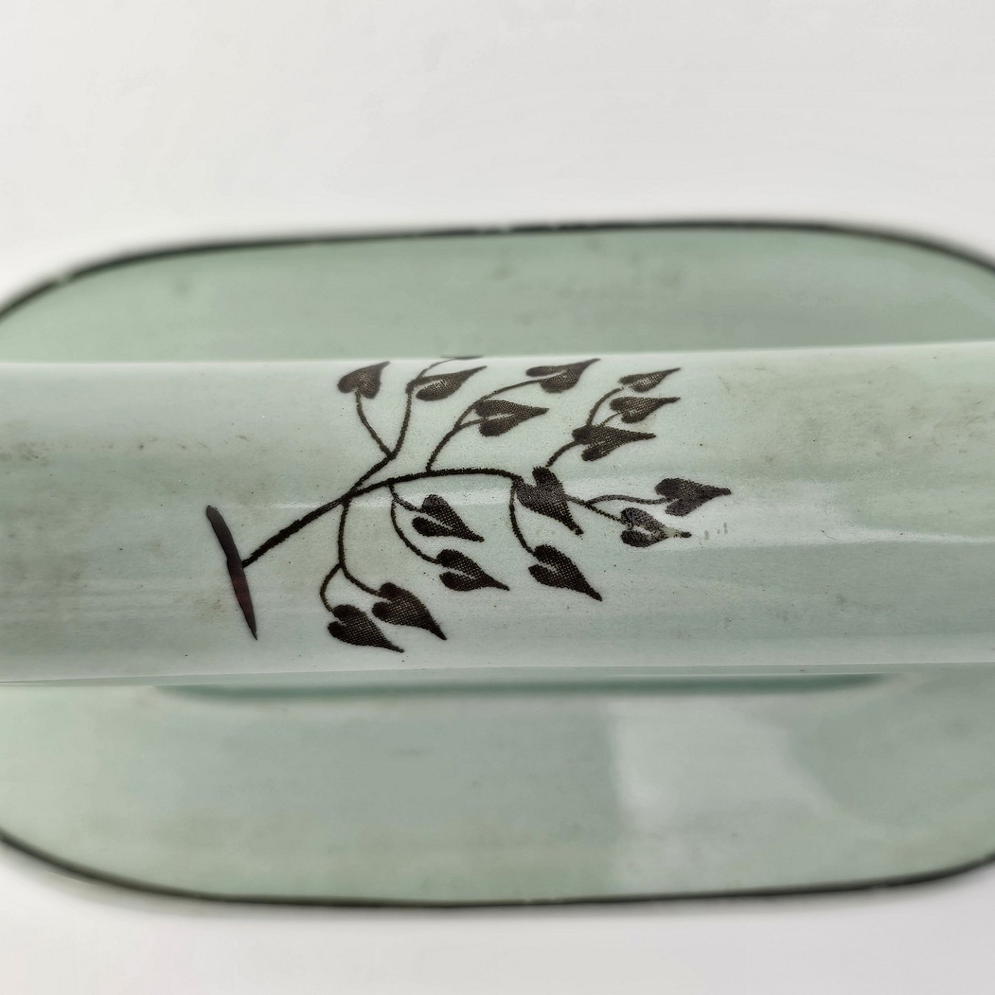 Stel i lysegrøn fajance med natur dekoration og flettet kant