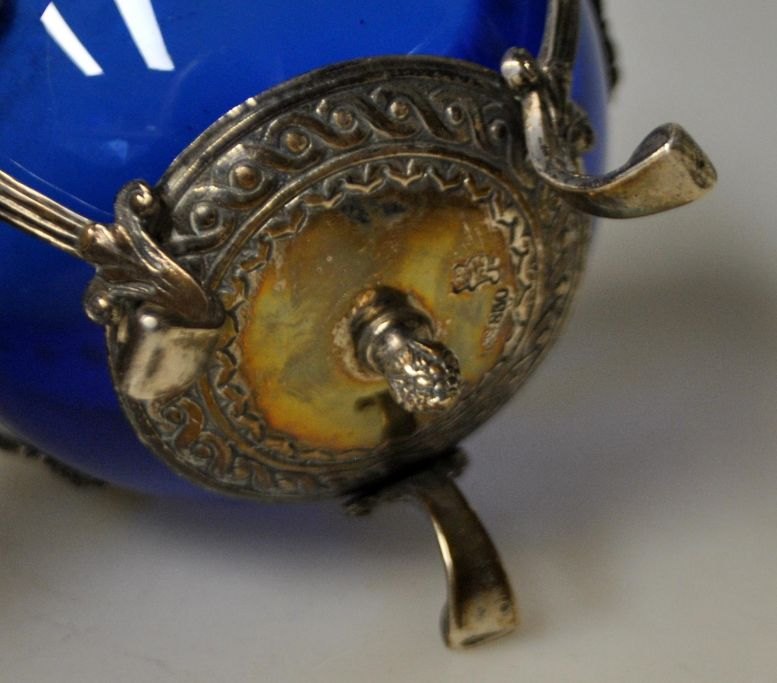 Sukkerkumme i sølv med cobolt blå indsats i glas, 19. årh. Dekoreret me Baccus og ranker. Stemplet.: 830 og utydeligt mestermærke. H.: 8 cm. Dia.: 8,2 cm. Vægt sølv: 117 gram.