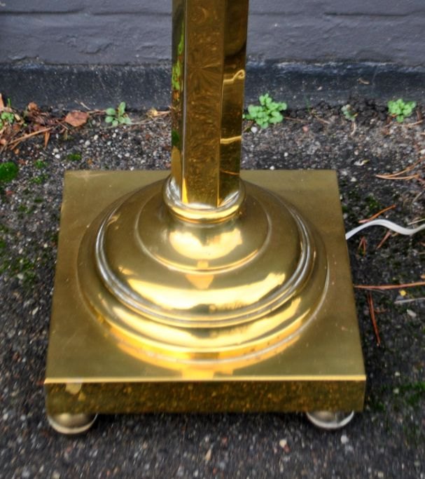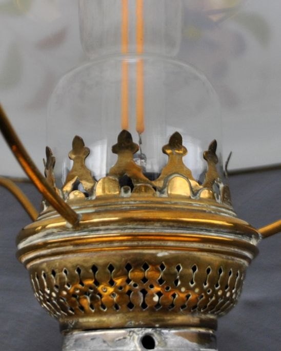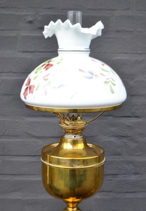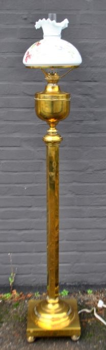 Stander petroleumslampe, ca. 1900. Messing. Omgjort til el. Med stor hvid glaskuppel med emalje dekorationer af blomster. H.: 153 cm. Dia. skærm: 27 cm.