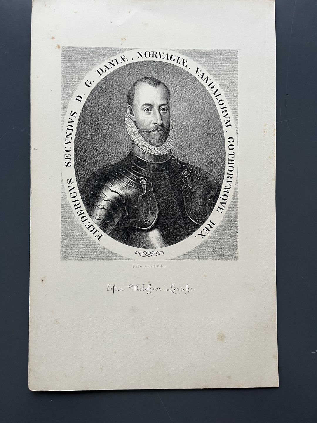 Portræt af HM Kong Frederik II af Danmark og Norge - litografi af Em. Bærentzen 1868.
