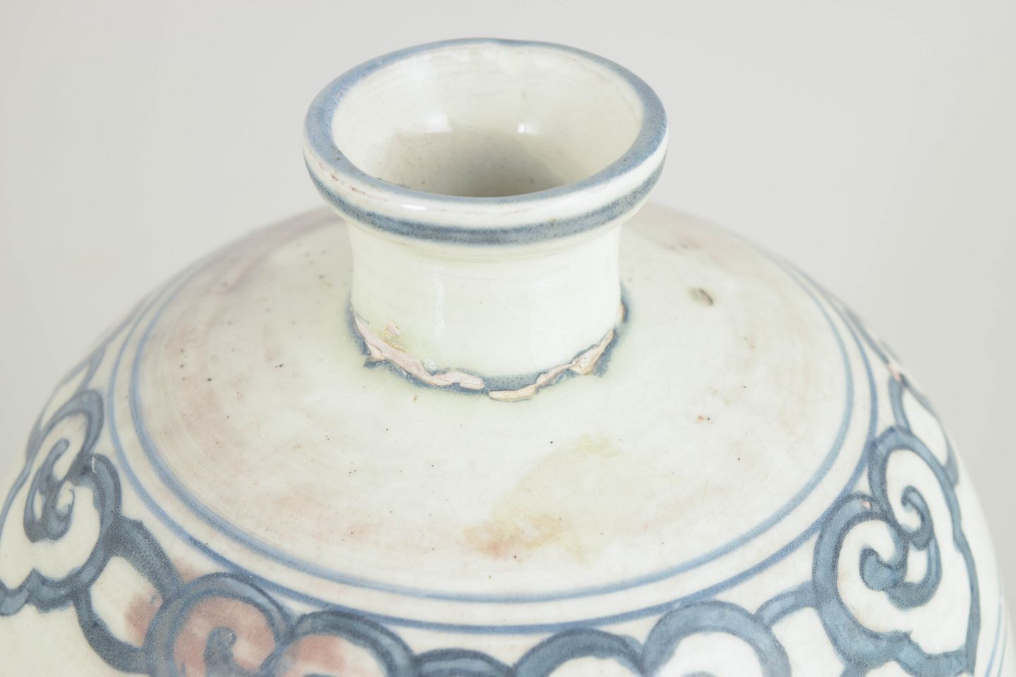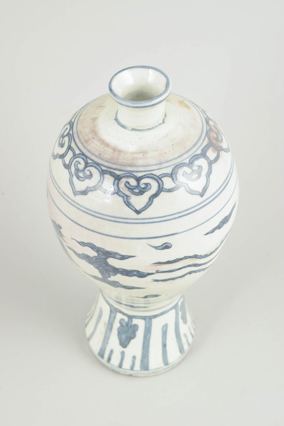 Balusterformet porcelænsvase med indsnævret hals og udsvajet fodring, dekoreret i underglasurblå. Motivet viser en føniks (fenghuang), der flyver blandt stiliserede skyer, et klassisk kinesisk lykkesymbol forbundet med dyd, harmoni og kejserlig symbolik. Skulder og fod er fremhævet med ornamentale borter. Klassisk og velafbalanceret form.