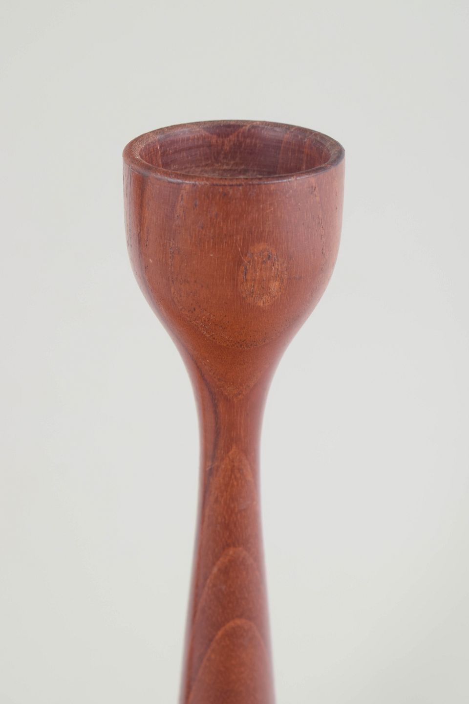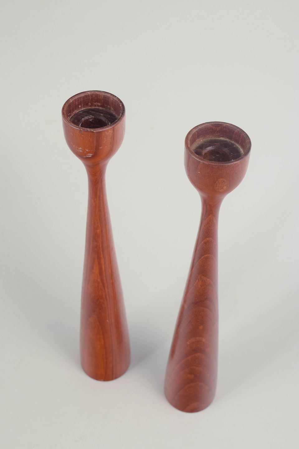 Par elegante, slanke lysestager i drejet massivt træ med let konisk form og diskret udvidet top. Det enkle og harmoniske formsprog understreger træets naturlige åretegning og giver et klassisk modernistisk udtryk.