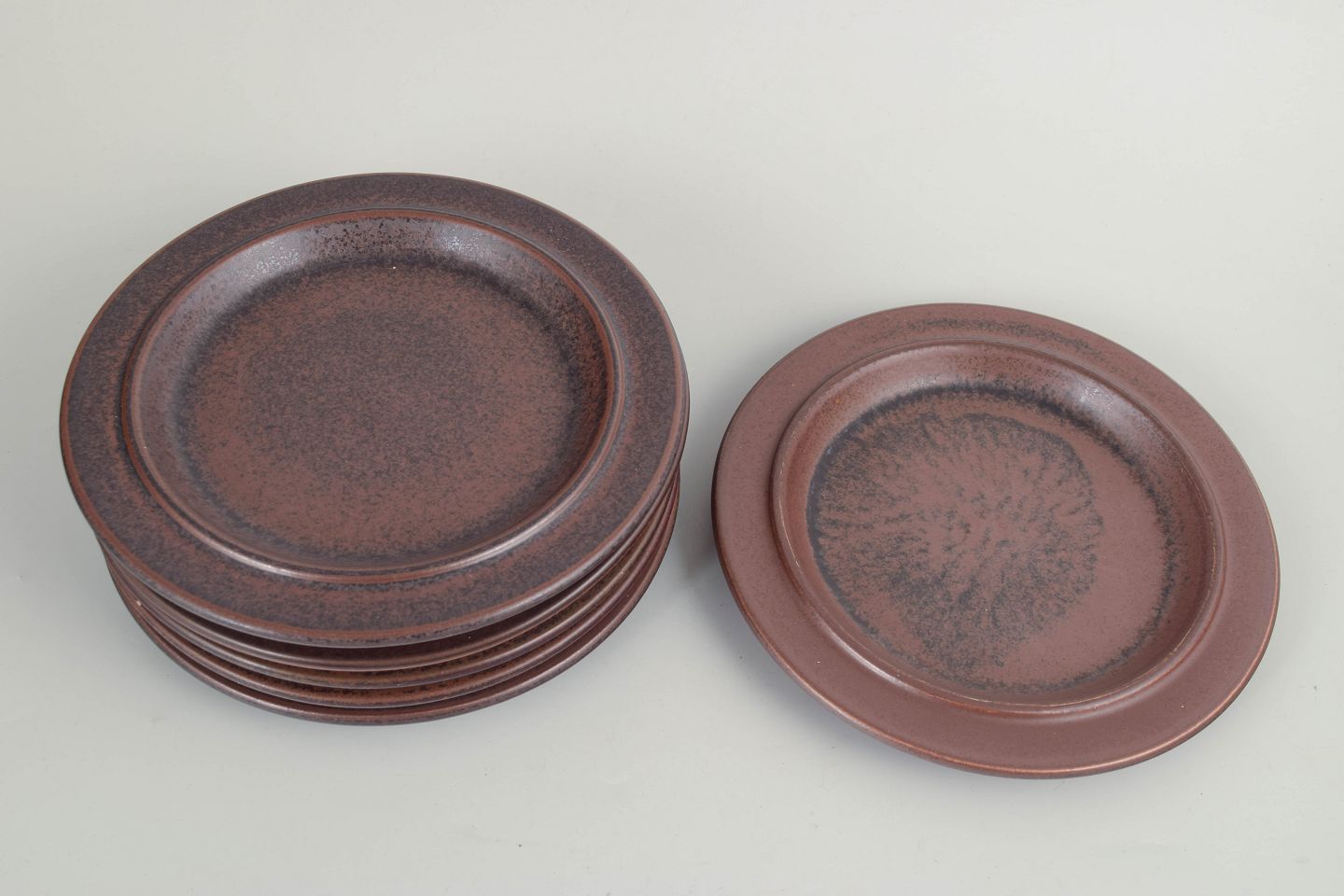 Sæt bestående af seks tallerkener i stentøj fra Ruska-serien hos Arabia, udført med den karakteristiske, melerede brune glasur i varme jordtoner. Klassisk cirkulær form med let forhøjet fane og levende glasuroverflade, hvor naturlige variationer giver hvert stykke et individuelt udtryk.