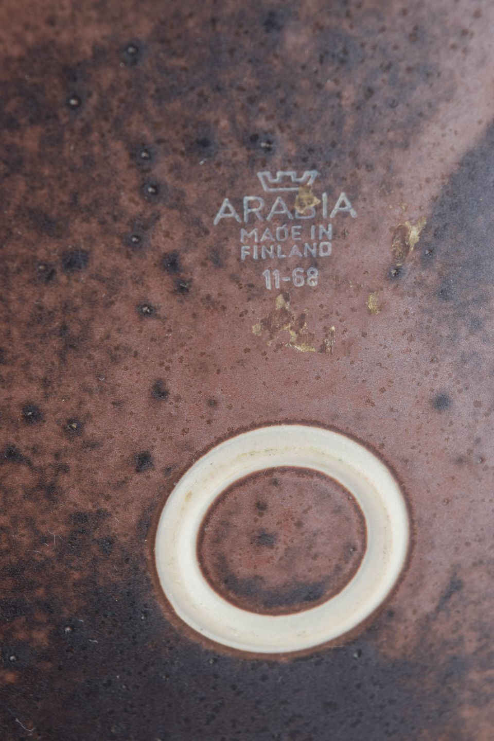 Fad i stentøj fra Arabia udført i Ruska-serien med karakteristisk, meleret brun glasur i varme jordtoner. Klassisk cirkulær form med let forhøjet fane og levende glasuroverflade, hvor farvespillet varierer naturligt fra stykke til stykke. Model fra Ruska-serien.