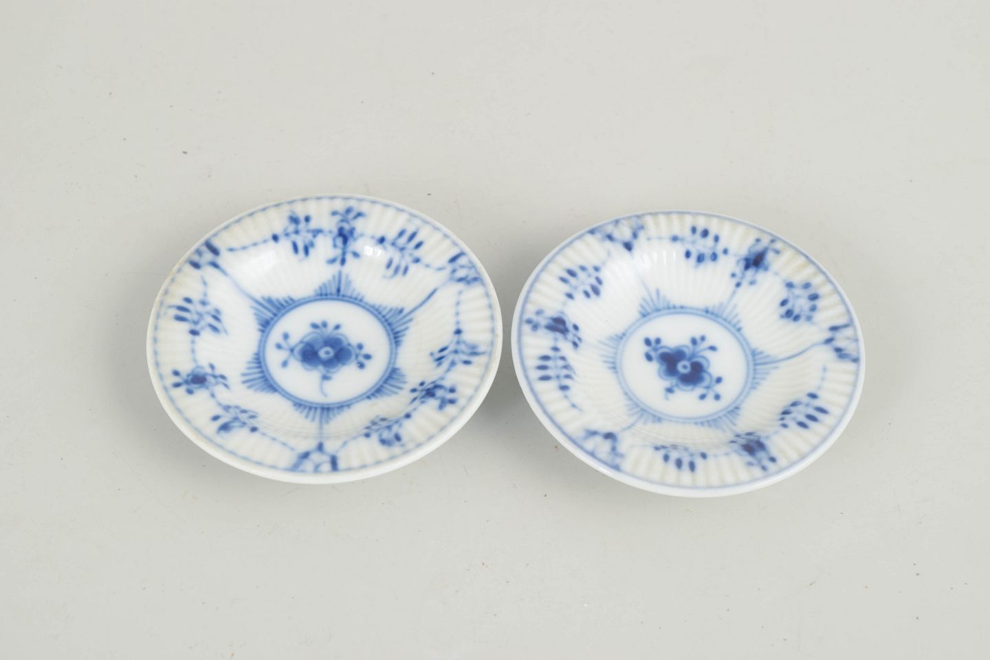 Sæt bestående af to små rillede skåle i glaseret porcelæn med håndmalet underglasurdekoration i koboltblå. Lav, rund form med let hævet fod. Model 1/7.