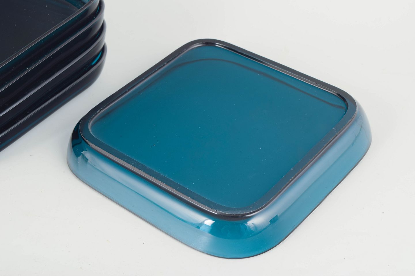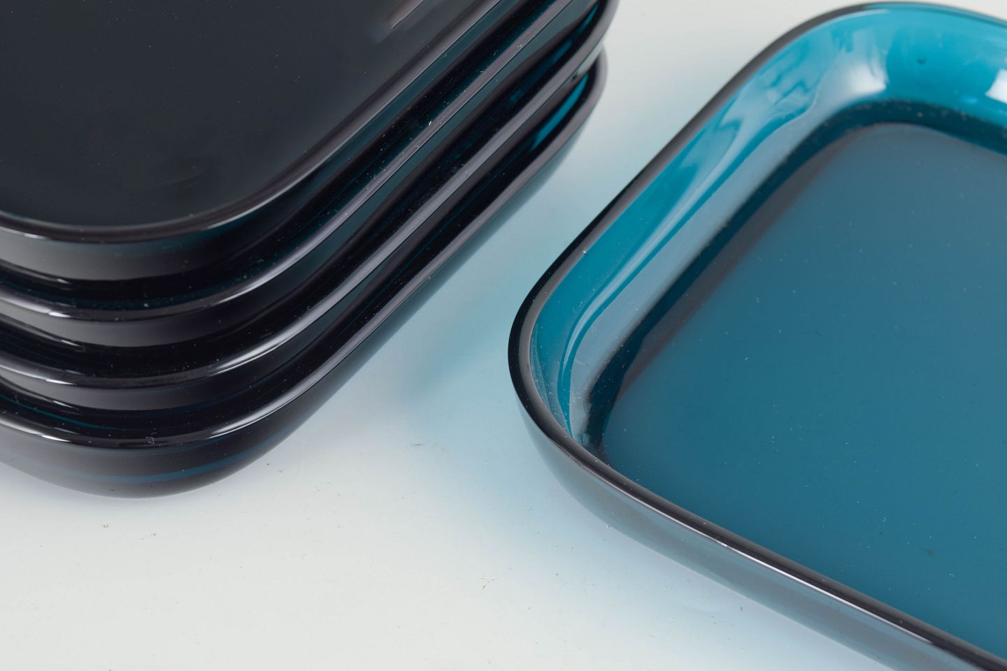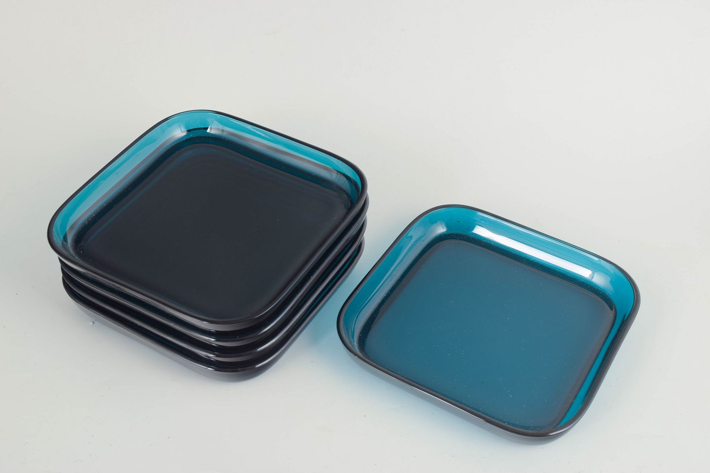 Sæt bestående af fem lave, kvadratiske fade i håndlavet kunstglas med blødt afrundede hjørner og transparent blågrøn tone. Enkelt, stramt formsprog med let hævet kant og glatpoleret overflade, hvor lyset fremhæver glassets dybde og farvespil.