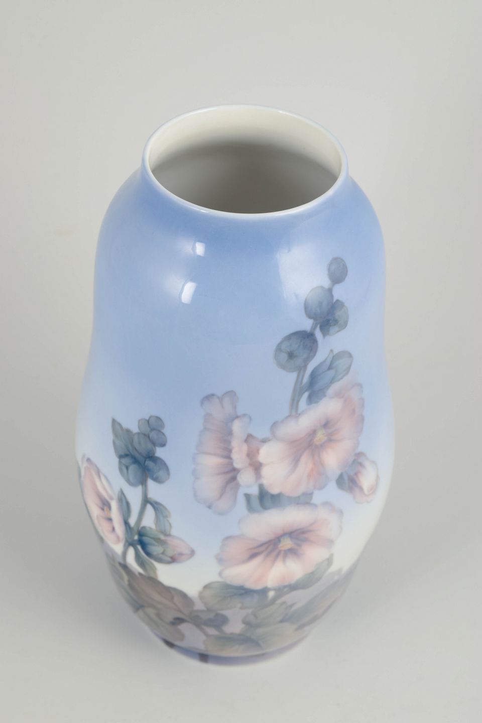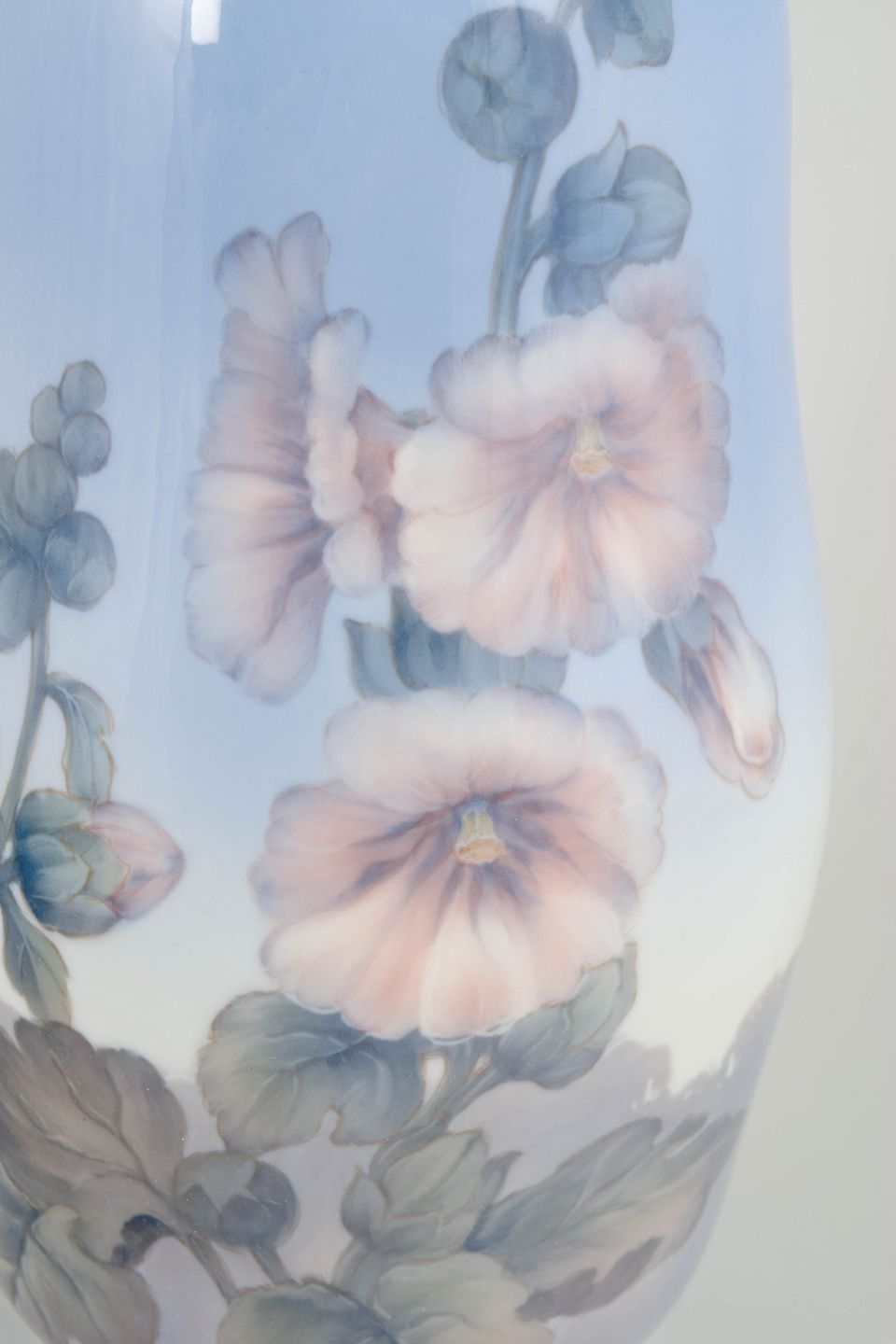 Stor, elegant balusterformet vase i glaseret porcelæn med håndmalet underglasurdekoration af blomster og løv i bløde rosa, grønne og grå toner mod en sart blå tonet bund. Dekorationen er rigt nuanceret og harmonisk afstemt med vasens generøse proportioner.
