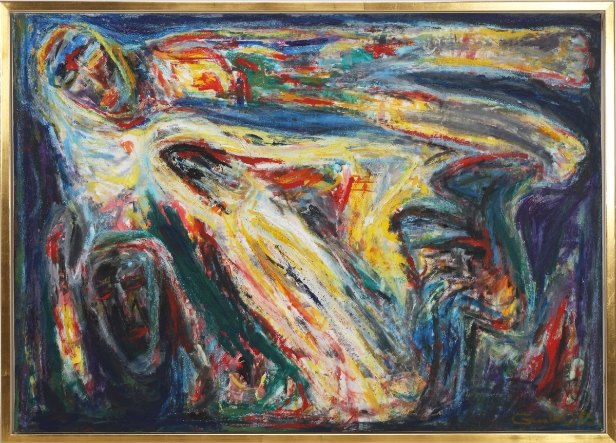"Komposition" Ekspressivt oliemaleri, monteret i kraftig forgyldt svæveramme.