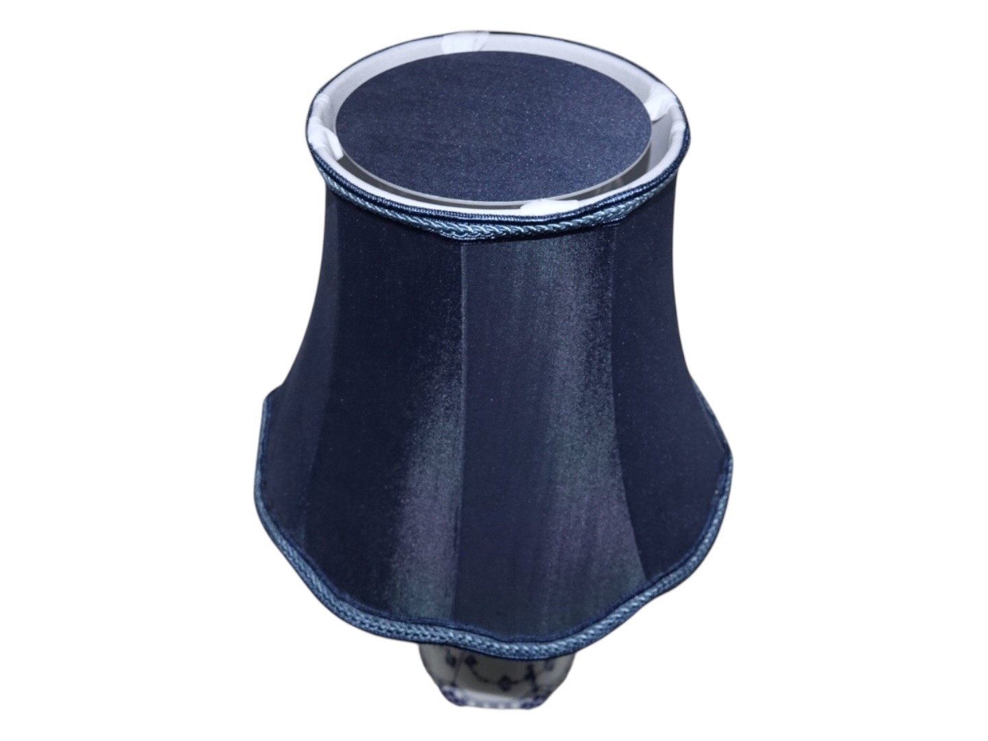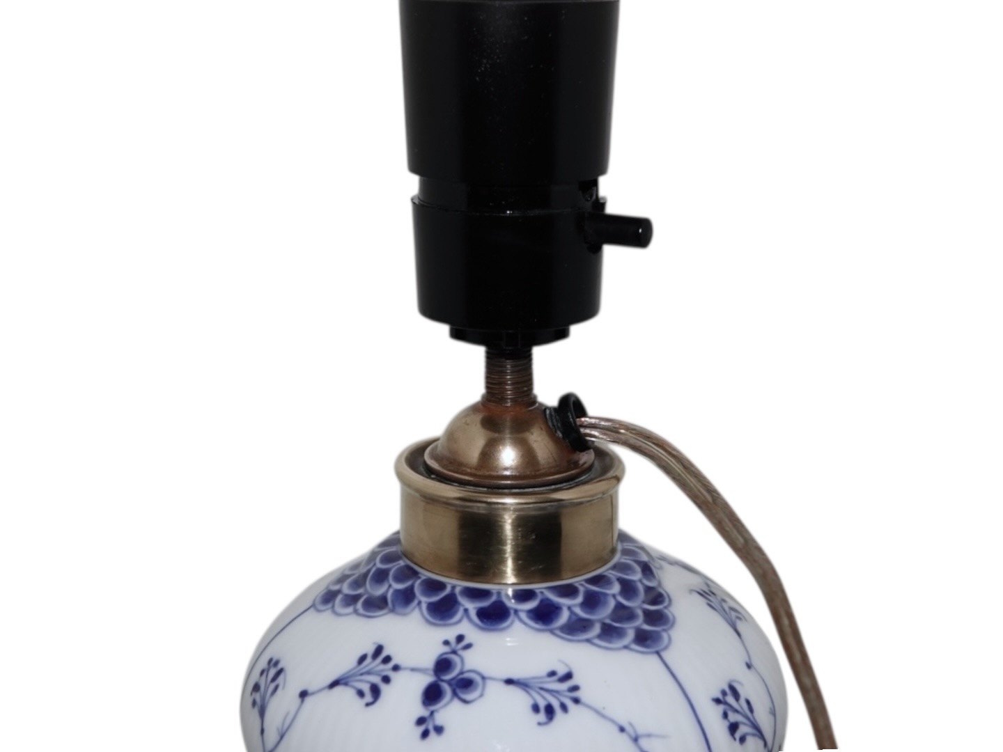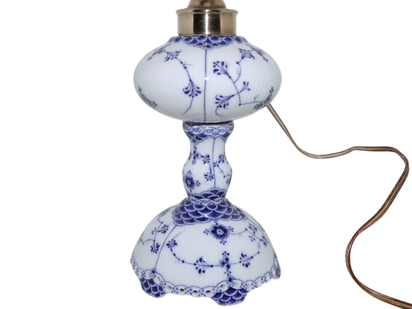 Royal Copenhagen Musselmalet Riflet, sjælden bordlampe monteret med en blå skærm. Den hører til Musselmalet Riflet men er med Helblonde kant.