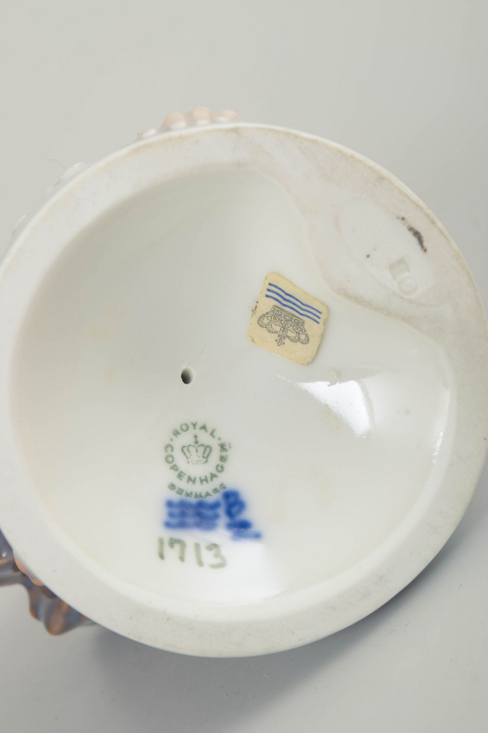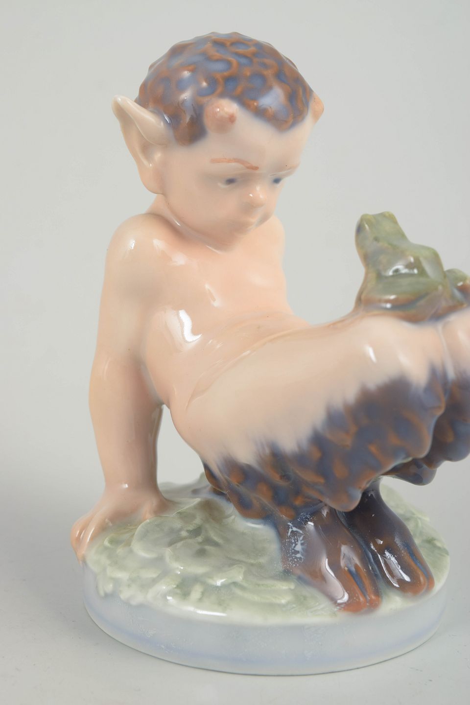 Figur i glaseret porcelæn forestillende en faun og frø siddende på en base med naturalistisk modellering og bløde farveovergange i afdæmpede pasteller. Model 1713.