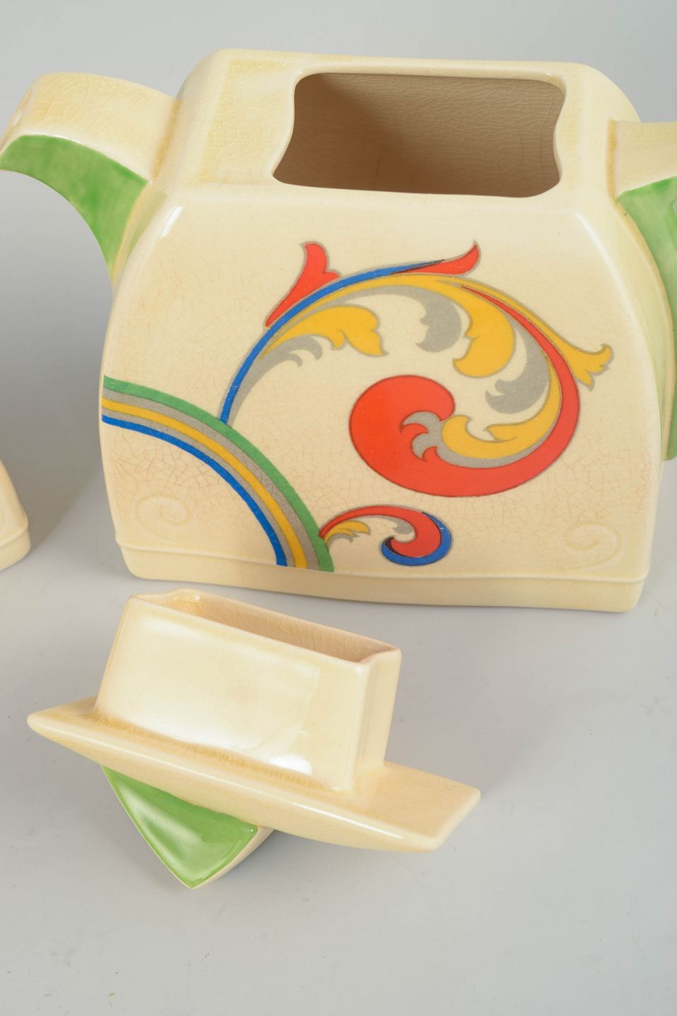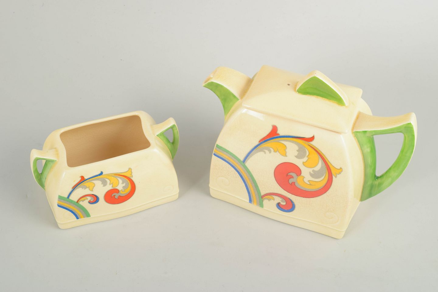 Art deco-tekande og sukkerskål i fajance med håndmalet dekoration i “Syren”-serien. Begge dele har karakteristiske, kantede former med grønne hanke og låg samt det dynamiske, stiliserede blomstermotiv i klare farver, som er typisk for Clarice Cliffs formsprog.
