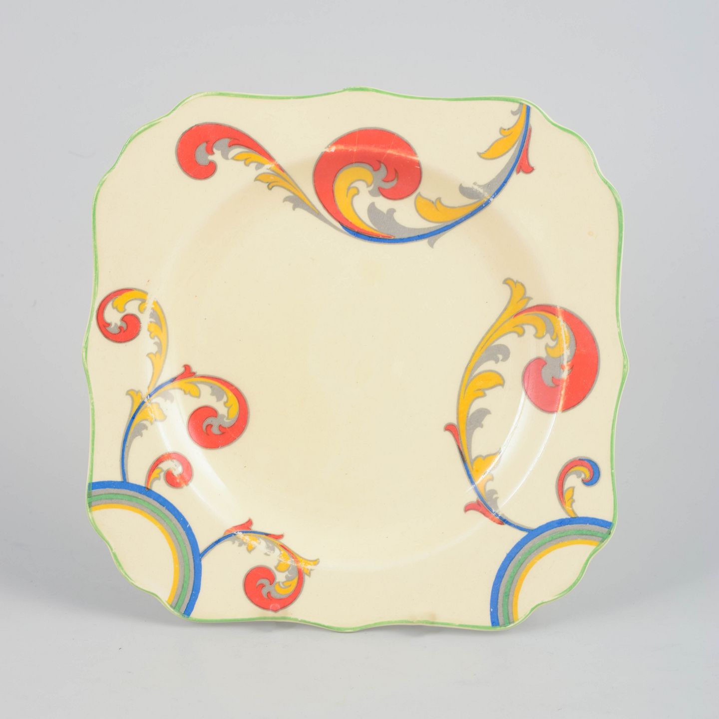 Art deco-fad i fajance med håndmalet dekoration i “Syren”-serien. Fadet har let firkantet form med blødt bølget kant og et levende, stiliseret blomstermotiv i klare, kontrasterende farver, karakteristisk for Clarice Cliffs dekorative formsprog.