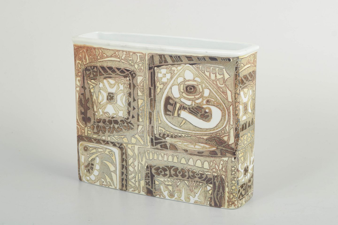 Rektangulær vase i fajance med reliefdekorerede felter og karakteristisk geometrisk ornamentik i afdæmpede jordfarver og lyse kontraster. Vasen er udført i Nils Thorssons velkendte formsprog fra Baca-serien, med tydelig inspiration fra arkæologiske og grafiske motiver. Overfladen har en markant taktil struktur, hvor dekorationen er integreret i formen og skaber et harmonisk helhedsudtryk. Model 719/2942.