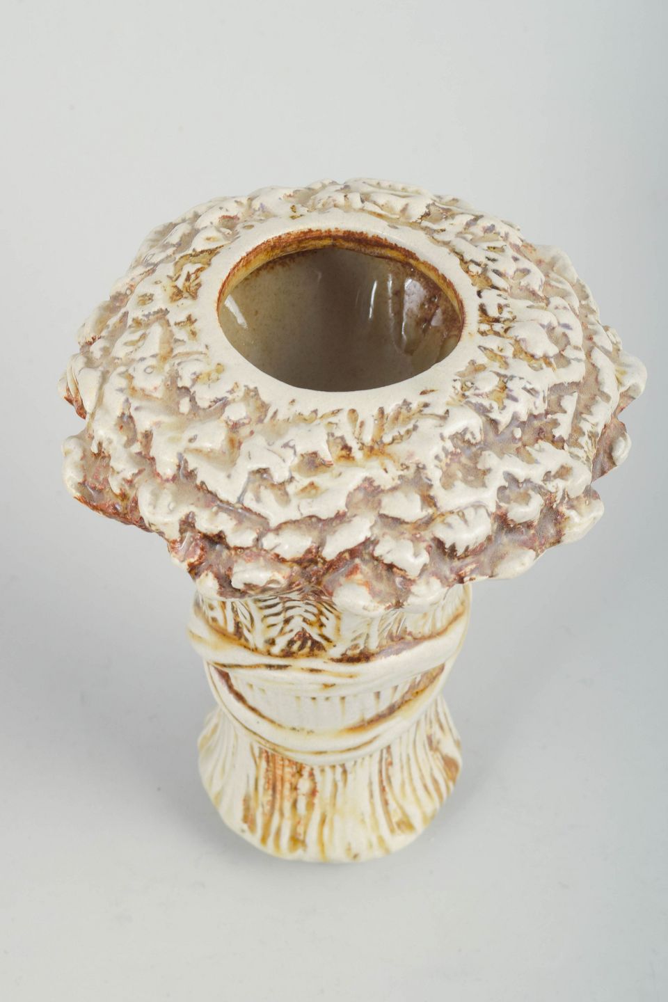 Kraftfuldt formet vase i stentøj med markant reliefdekoration og kraftig, løbende glasur i cremefarvede og brune nuancer. Overfladen har et tydeligt, næsten barklignende udtryk, der understreger det skulpturelle formsprog. Signeret “KB” i bunden. Udført hos Höganäs Keramik og dateret til omkring 1960’erne.