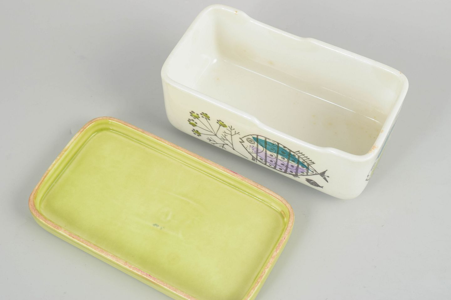 Sjælden rektangulær smørkrukke i fajance med originalt låg i lysegrøn glasur. Dekoreret med stiliserede fisk og planter i turkise, lilla og grønne nuancer – et legende og karakteristisk motiv fra Rörstrands “Petri” serie.