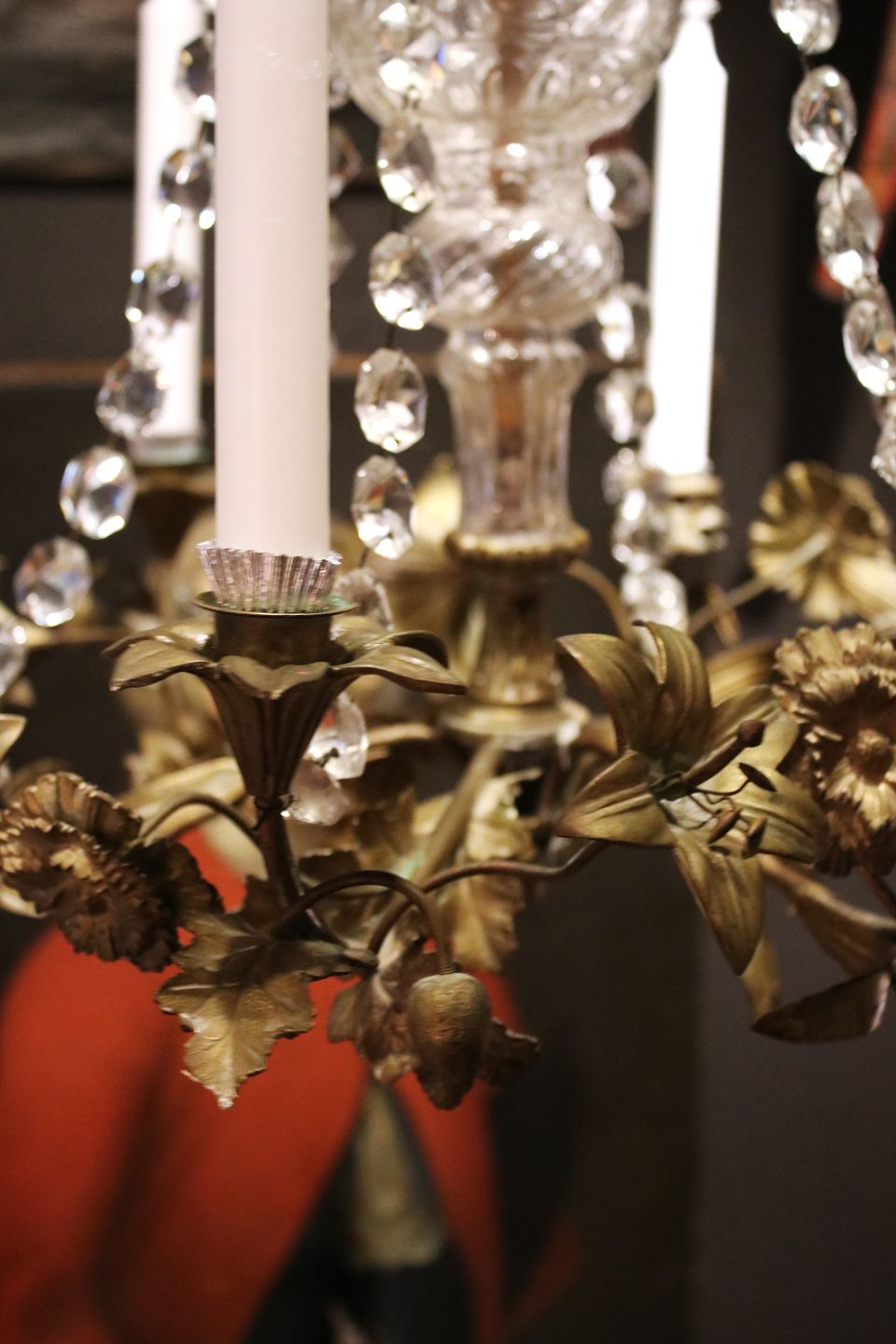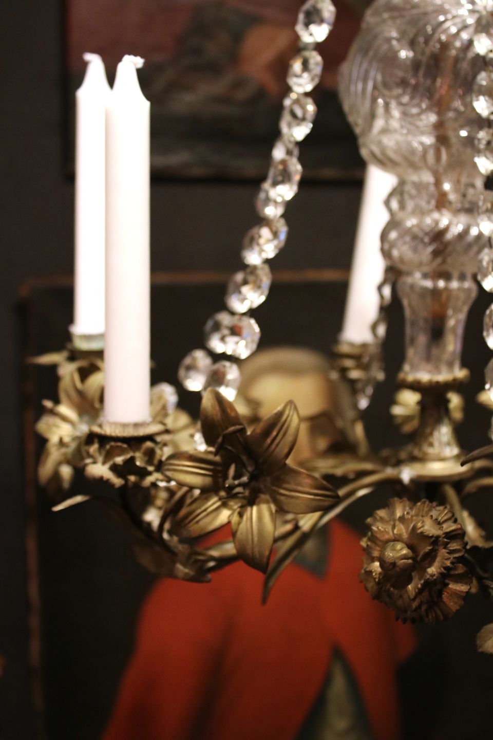 dekoreret med fine bronze blomster , prisme kæder og glasrør.