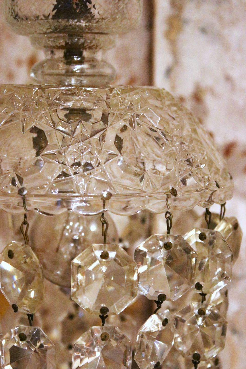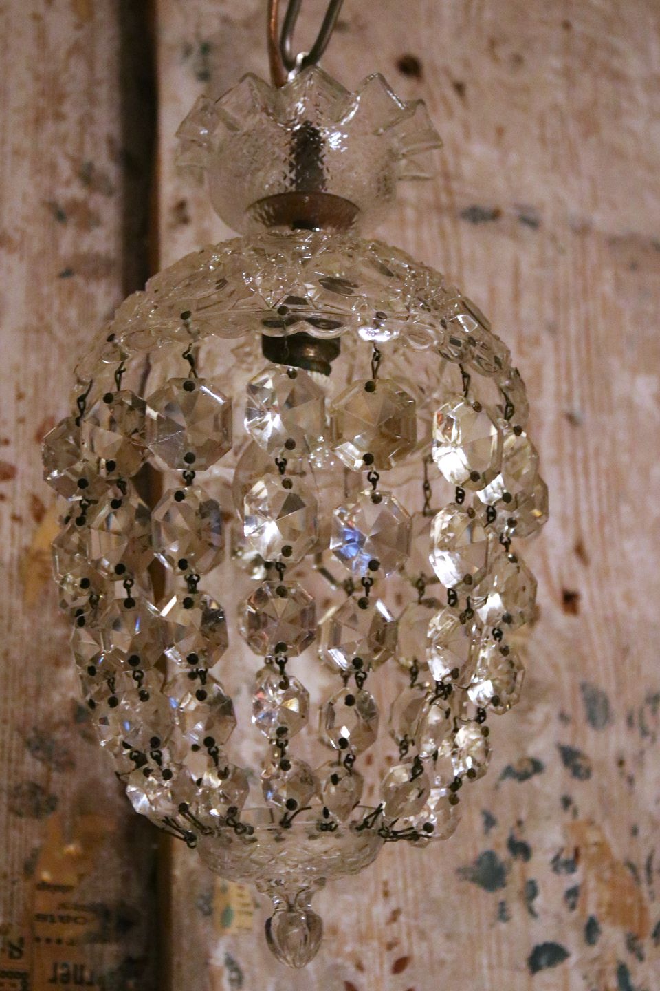 Gammel "pose prisme" loftslampe , glasskærm med kæder af fine slebne glas prismer...