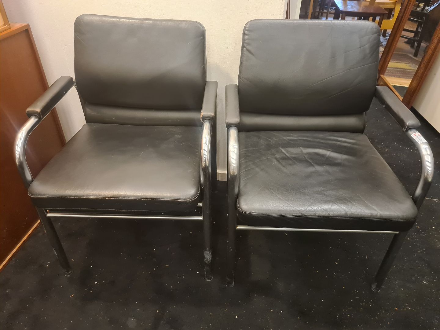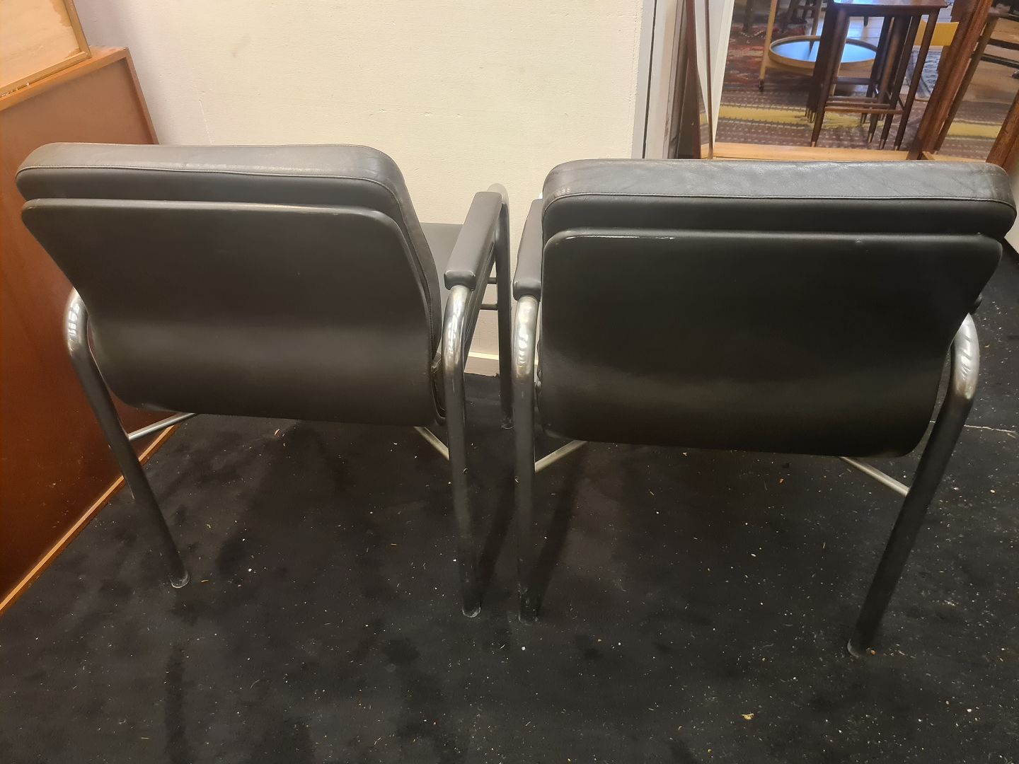 Par armstole produceret hos Fritz Hansen i 1981. Fremstillet i stål og læder. Fremstår gode og stabile dog med lidt overfladiske brugsspor på den ene på sæde og armlæn. (Billede)