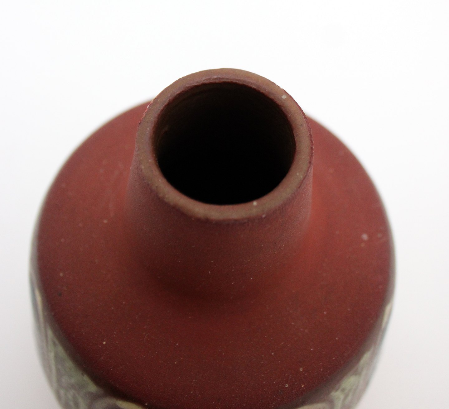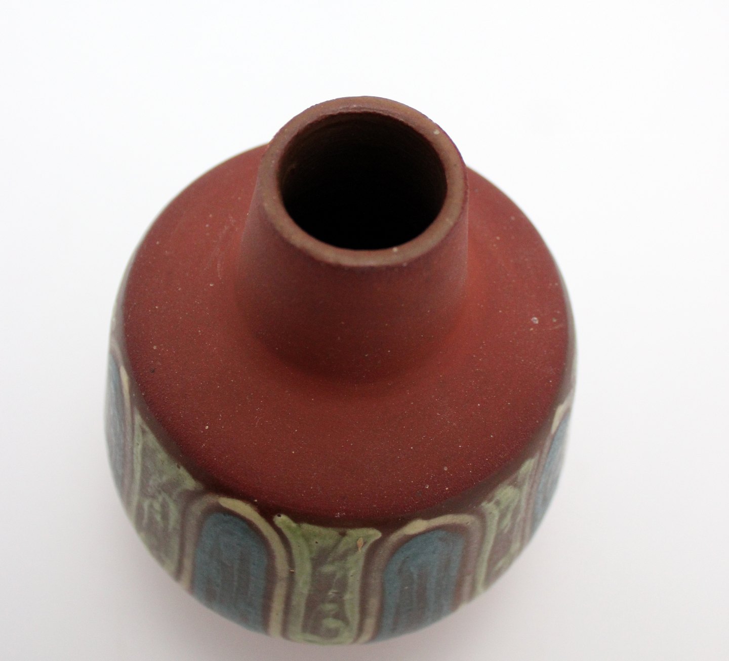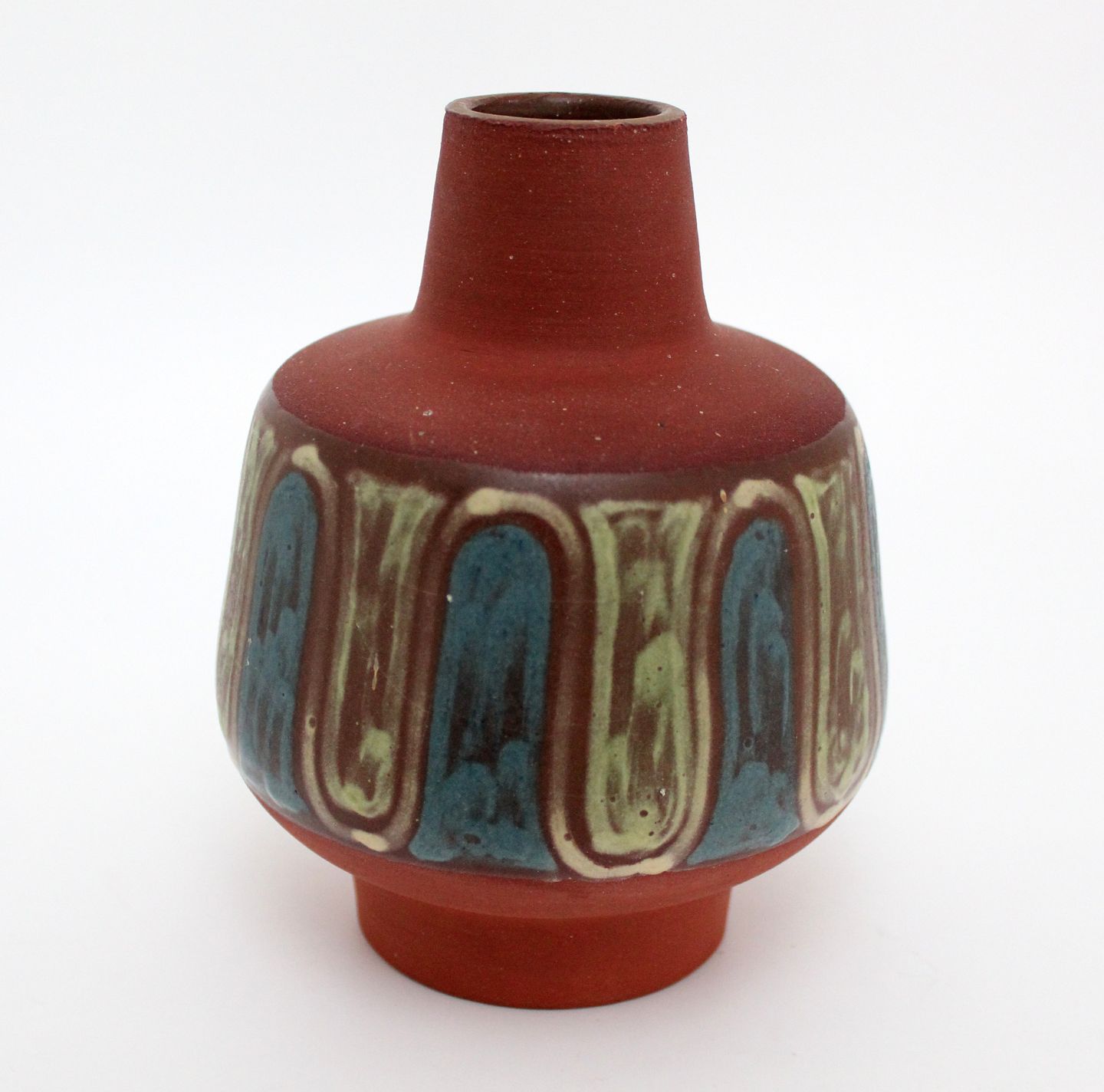 Johannes Andersen eget værksted. Vase fra 1950'erne. Rødbrun ru og mat glasur med bånd af grøn og blå glasur. Nr. 304. Signeret JA DANMARK. Højde 14 cm. Største diameter 10 cm. God stand, dog med en krakelering i båndet og så hvide prikker i den røde glasur. Pris: 250 kr.