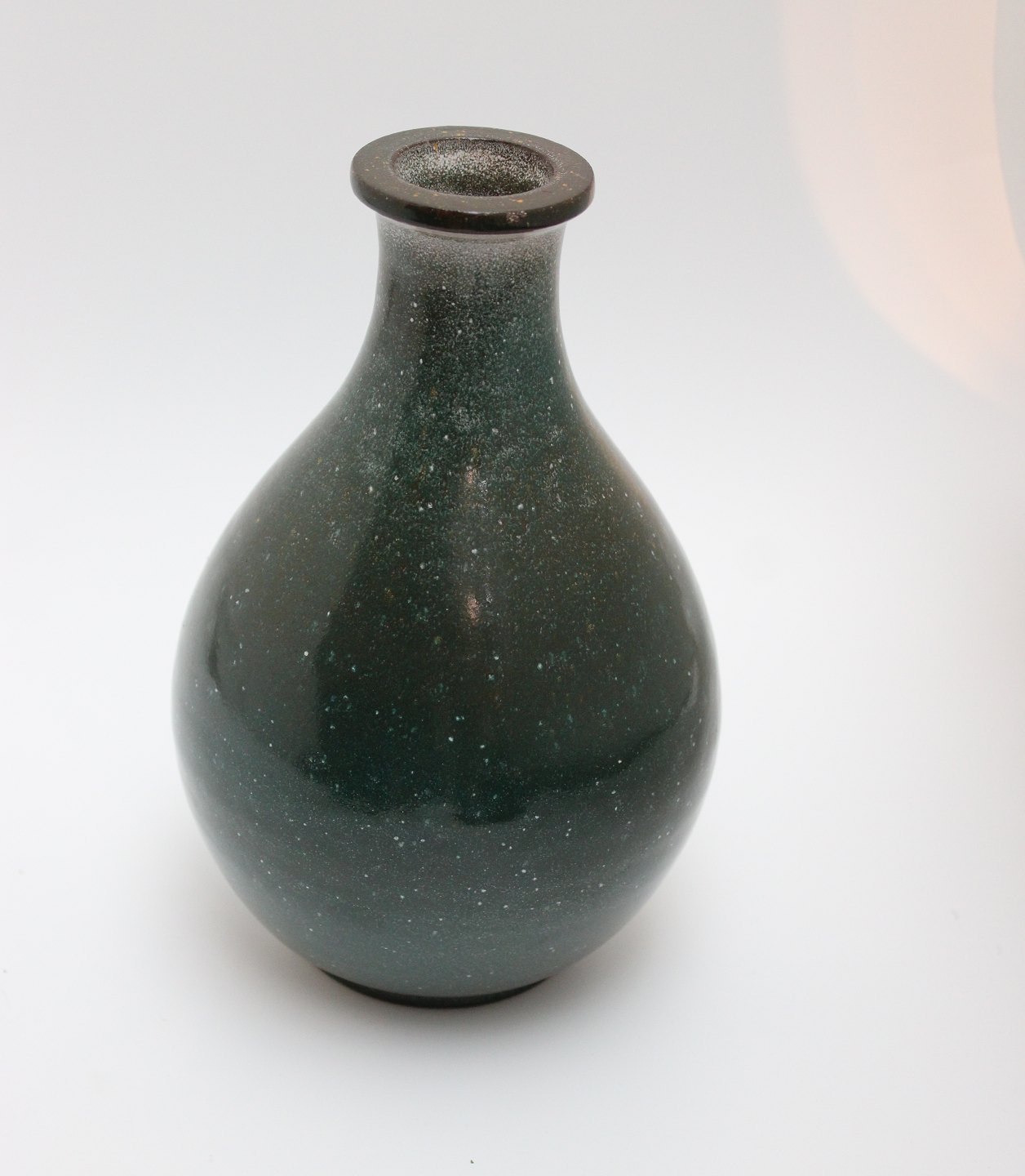 Smuk vase i grønnistret glasur med brun kant. Der er et lille glasur afslag i kanten. Signatur OJ. Højde 19 cm. Største diameter 12 cm. Pris: 350 kr.