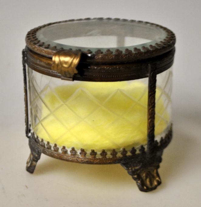 Smykkeskrin, Frankrig ca. 1900. Med facetteret glas og dekoreret messing ramme og tre ben. H.: 8 cm. Dia.: 8 cm.