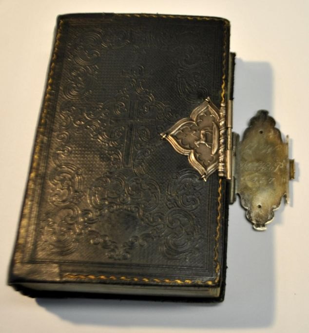 Salme bog i sort læderindbinding og sølv beslag, 1854. Sølvbeslag med lammet og Kristi på korset. Beslaget er fra 1867. H.: 12 cm.