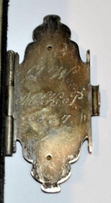 Sølvbeslaget med indgravering: J. W - M.K.P 1867.