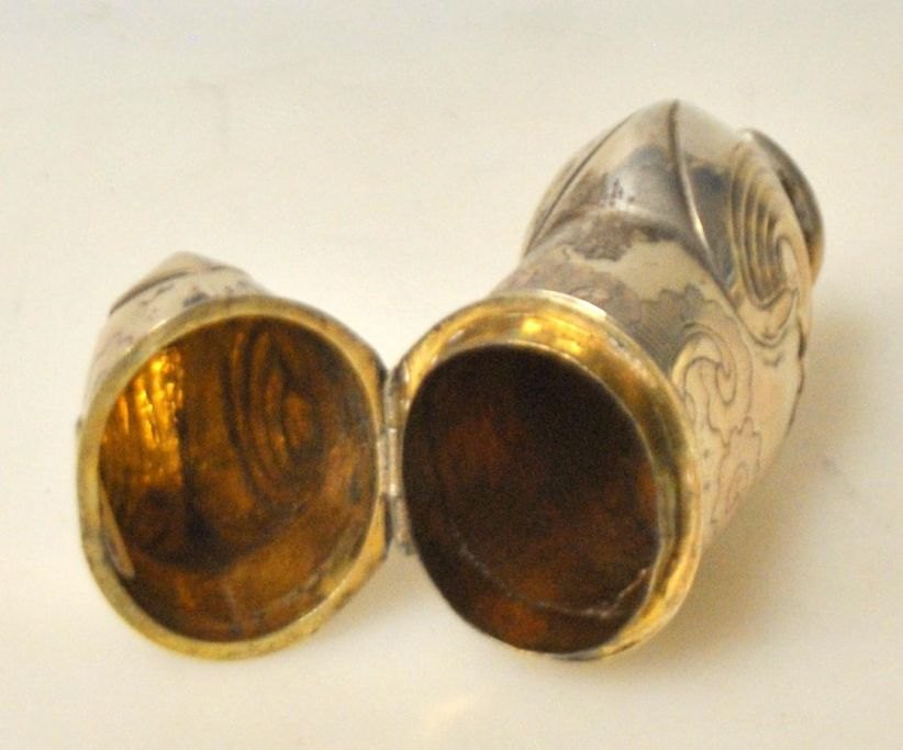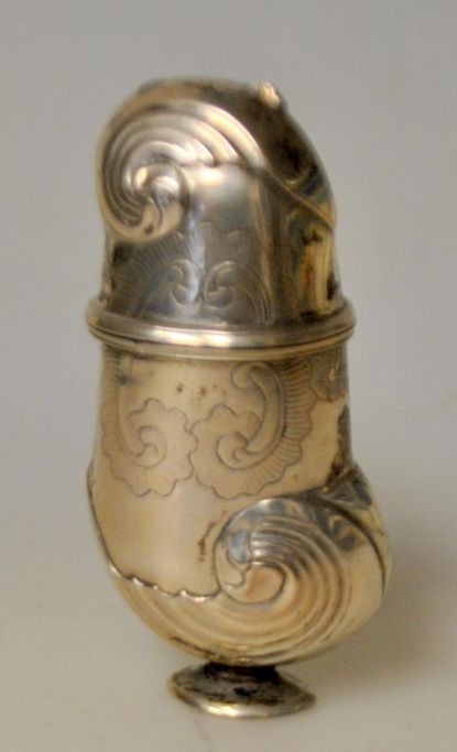Rococo hovedvandsæg i sølv, 18. årh. Danmark. Med udvendige rococo dekorationer. Indvendig lueforgyldt. Ustemplet. H.: 7,5 cm. På nyere oval fod.