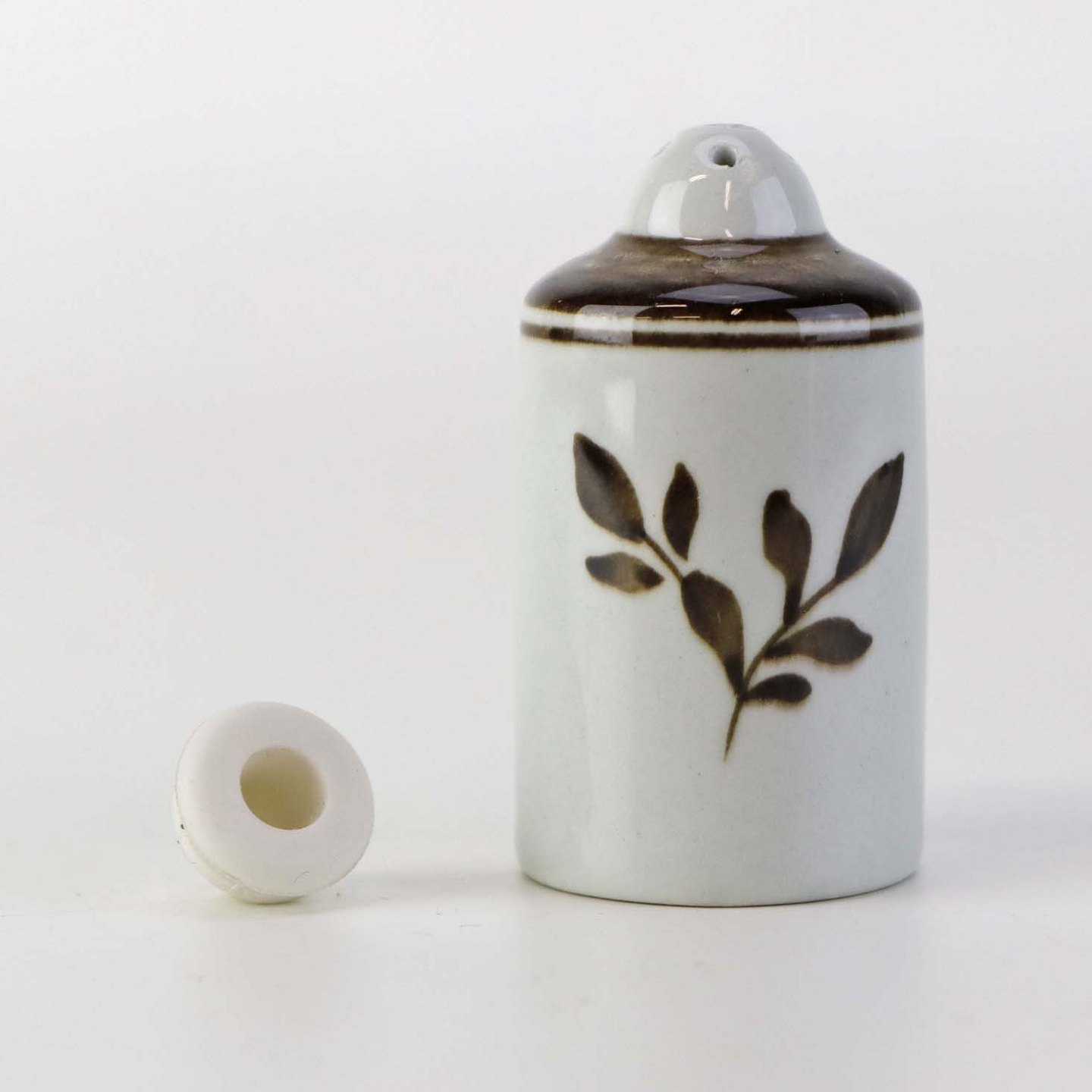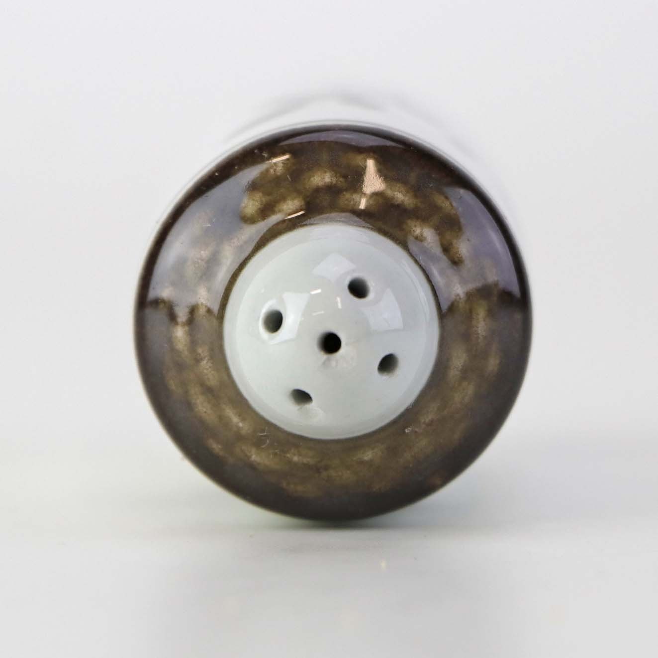 Lille peberbøsse i fajance fra stellet Brun Tranquebar fra år 1919. Nr 45/1008