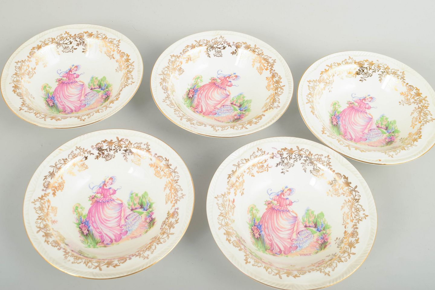 Sæt med fem fajanceskåle med trykt dekoration i pastelfarver med figurmotiv i midten samt rigt udformet, gylden bladranke-bort langs kanten.