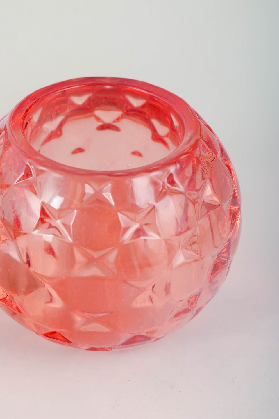Et par kugleformede fyrfadsstager i presset glas med en facetslebet, geometrisk overflade og transparent rosa farvetone. Den skulpturelle, juvellignende form forstærker lysets spil, når de er tændt, og er karakteristisk for Kjell Engmans ekspressive tilgang til svensk studioglas og kunstglas i slutningen af det 20. århundrede.